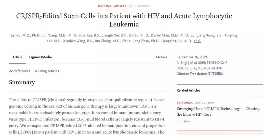 该研究的目的是复制“柏林患者” Timothy Ray Brown的成功案例。2008年,感染HIV的患者Brown接受了骨髓移植以治疗白血病,并因此成为已知的第一个清除HIV的患者。科学家在骨髓供体中找到了一个基因突变,该基因突变可以使CCR5蛋白失效,该蛋白被HIV用来感染免疫细胞。但在骨髓供体中发现的这种保护性突变很罕见,且在很多地方的人群中都不存在,包括中国。邓宏魁团队是发现CCR5在HIV中重要性的团队之一,因此,该团队决定尝试编辑该基因。2017年,邓宏魁团队建立了利用CRISPR-Cas9进行人造血干细胞基因编辑的技术体系,该技术比传统的基因编辑技术更易操作、成本更低。研究团队从供体骨髓中获取与患者免疫匹配的造血干细胞,利用CRISPR-Cas9对其进行编辑,然后移植到感染HIV的白血病患者体内,以精确模仿柏林患者。为了安全起见,同时也因为造血干细胞难以进行基因编辑,邓宏魁团队进行了混合细胞移植,其中约18%的细胞进行过基因编辑。结果显示,患者的白血病得到缓解,其体内仍存在HIV病毒。在随后19个月的临床观察中,该患者短暂停止服用抗HIV病毒药物,CD4细胞中的CCR5基因编辑效率有明显上升,证明CCR5基因编辑的T细胞表现出一定程度抵御HIV感染的能力。重要的是,基因编辑细胞仍保留在这名患者的体内,表明基因编辑效果在血液细胞中始终稳定存在,未发现基因编辑造成的脱靶及其他副作用。2019年9月,该研究成果发表在《新英格兰医学杂志》。图片来源:NEJM