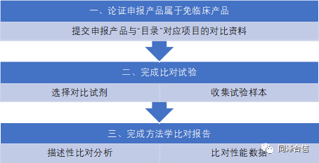 四、免临床目录内产品评价路径浅析 免于临床试验的产品,可以通过临床试验之外的路径来完成临床评价。但不同于一般医疗器械产品可以采用文献资料、经验数据等完成临床评价,IVD产品的临床评价方式有较为严格的限定,即只能通过方法学比对来完成临床评价。尽管尚未正式发布的《免于进行临床试验的体外诊断试剂同品种比对技术指导原则(征求意见稿)》,单从其名字上和此前版本的内容中,我们并未看到同品种比对是否就是临床评价的唯一方式的相关规定,不过指导原则中有这样的表述: