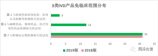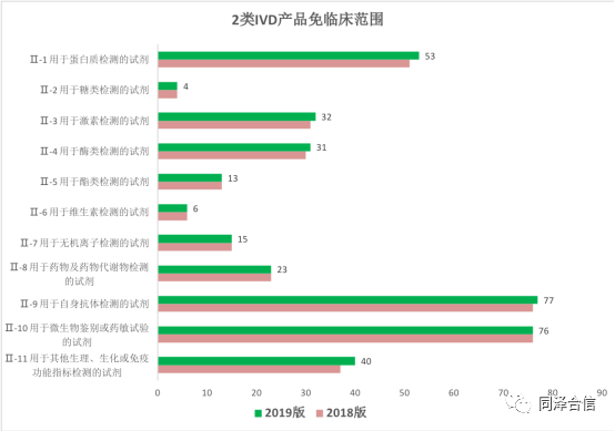 2019年12月,NMPA再次释放利好消息,发布了《关于公布新增和修订的免于进行临床试验医疗器械目录的通告》(2019年第91号),继续扩大了医疗器械和体外诊断试剂免临床目录的范围。 一、最新版目录内容解析 2019版目录,在2018版目录(2018年第94号文)的基础上,新增23项体外诊断试剂产品,对4项体外诊断试剂产品的名称和描述进行了修订,形成了截止目前最新的一版免临床目录。其中IVD产品2类合计有370个免临床,涵盖《注册管理办法》列举的全部11个种类;3类合计有46个免临床,继肿瘤标志物后,这次扩展到了病原体和毒麻类检测。
