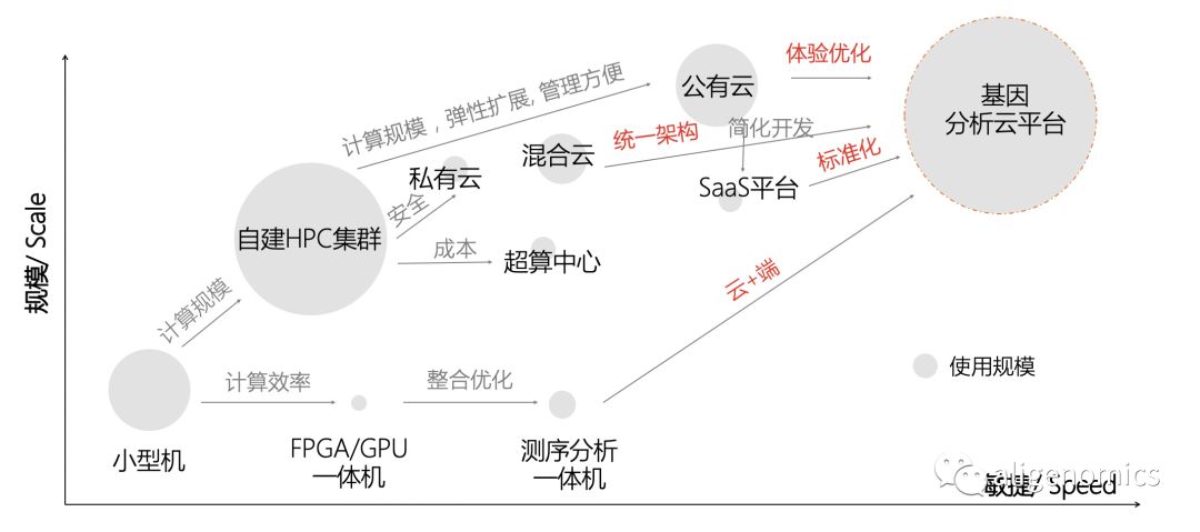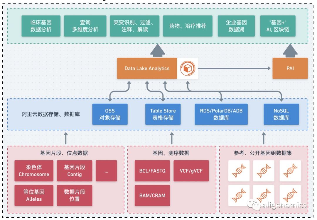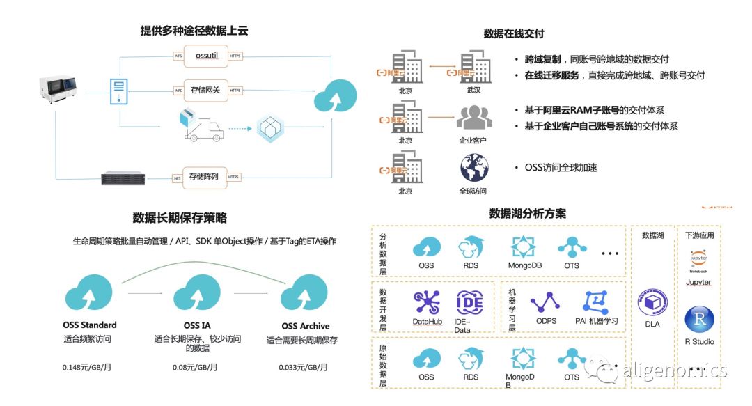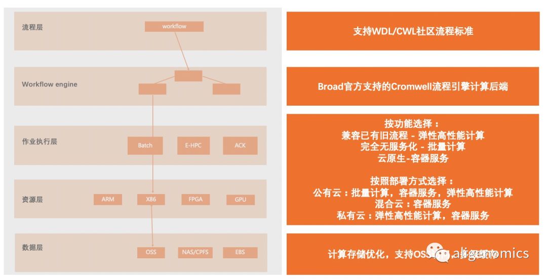 基因行业同时具备数据密集型和计算密集型的业务特点,云计算的出现有利于我们来帮助生物学家、医生们来解决这些底层的IT问题,只需要专注在数据或者业务本身即可。从众多客户的经历来看,我们看到了以下转变的趋势。 转变使用模式 基因行业客户,从个人用户到政府的基因组学机构,规模差异很大。在过去几年时间内,出于成本、业务、管理、开发等等因素的考虑,可能使用的方案,从单台服务器,到大型高性能计算集群,SaaS平台都有,种类多样。但是随着业务规模增大和分析速度下降,云计算以其弹性扩展,按需付费的最大优势,成为所有方案演化的方向或必不可少的组成成分。对于初创型的公司,可以完全基于云环境的各种产品和服务,0成本、敏捷快速的构建自己云原生的业务系统。对于已有大型集群的客户,可以通过混合云的方案,来最大化利用本地资源,同时又利用云的弹性来消化业务高峰,避免再采购资源。 重视数据资产 基因公司都应该是大数据公司。随着自身业务的开展,内部积累的样本数据也是越来越多。在达到千万级别的显著规模,如何利用样本数据去构建知识库,建立变异基线,开发和优化临床应用,是每个用户都需要考虑的重要问题。将基因数据,表型数据集中存储到阿里云上,构建统一的企业基因数据湖,使用阿里云DLA,EMR,PAI等丰富的分析产品生态来进行多来源,多种类,多维度的数据查询和高级分析工作。而不是自己使用初级的程序脚本读取文件解析,或者搭建维护一套难以满足真实生产需要的复杂系统。通过完整方法论和工具来进行数据治理和数据智能分析会是基因的核心竞争力之一。 标准化与自动化 基因公司都在进入精细化管理模式。在海量样本面前,难以通过更多的人工分析来跟上业务增长。同时在保证业务质量,满足外部评审要求等情况下,分析流程的标准化、模块化及自动化成为大家的共同的方向。与此同时,借助标准化,更能够清晰样本的存储和分析成本。通过阿里云存储阵列,函数计算,对象存储,批量计算这样的产品组合,可以实现数据下机之后自动上云,自动调用标准的WDL流程分析,并且最终交付到指定位置,等待释放,整个过程分析结果可重复,操作记录可审计,成本完全透明可控。这样的用户场景,和围绕这一过程的自动化生产系统和云平台,也必然会越来越多。 然而必须看到的是,将信息技术和生物技术结合,利用云计算和大数据的技术,来促进生物科研和产业的发展,还有很长的路要走。相较于国产测序仪进步,能够直接为阿联酋的项目提供测序服务,我们还必须在基因数据工具和平台上加快能力建设,才能匹配像UK Biobank这样的大型项目的实际需要,充分发挥基因大数据的价值。 阿里云基因行业解决方案 基因行业客户需要的从来不是,也不应该是存储、计算、网络等基础资源。我们需要从基因测序的不同场景来考虑用户从样本到报告的需求是什么,再提出完整的解决方案。不仅仅是阿里云本身,更需要行业上下游合作伙伴一起来构建完整的应用生态。同时,阿里云是全球基因组学与健康联盟(GA4GH)的成员,Cloud Work Stream小组成员,生物信息云计算产业促进会会员,我们也不断的从数据共享,行业标准的角度来为社区提供服务。 我们可以从三个角度,来谈谈阿里云的基因行业解决方案,我们为“全民”基因组时代准备的“新基础设施” 数据 通过阿里云,基因数据可以快速流动,不管是从测序中心,还是到下游客户,借助阿里云遍布全球的数据中心和高速网络的基础设施,可以在线交付数据。更重要的是,阿里云的众多的上下游共同的用户群体,已经形成了基因行业的“局域网”,更是确保能够双方的连通性。 我们为用户提供多种方式来传输和分发基因数据,并为不同规模的用户提供长期、经济、可负担的存储方案,保证数据安全和自动生命周期管理。用户业务数据可以沉淀到企业的基因数据湖中,并且利用阿里云多种分析产品进行机器学习、深度学习等进行数据挖掘。 阿里云对基因数据的存储和传输都提供严格的加密措施。用户可以使用服务端加密、客户端加密以及BYOK的方式来对基因数据进行加密。通过数据安全产品为帮助生物医学数据进行去身份化操作,同时满足包括HIPAA,GDPR在内的全球性行业监管法规需要。 计算生物信息流程是由一系列有依赖的分析步骤组成的,由分析引擎解析后,变成可运行的任务,再由后端的作业调度软件来执行。传统用户这三部分的组成,通常是由自定义的流程规则,以及对应的解析程序,加上SGE,SLURM这类的HPC集群作业调度软件来实现的。 阿里云支持GA4GH联盟下的流程语言标准(CWL/WDL),只要是符合标准的流程,都无需改动,可以在阿里云上直接执行。作为Broad的解析引擎Cromwell官方支持的计算后端,可以使用包括Call-Cache中断恢复在内的任意高级特性。与传统模式相比,流程的标准化、可迁移性和可重复性都得到大幅度提升,并且解决了对外标准不统一的问题。 阿里云计算产品EHPC,ACK,批量计算,作为WDL流程的底层执行引擎,都能充分发挥云计算的优势。对于用户来说,完全按照使用量来付费,并且可以在不增加成本的基础上,快速扩展规模以加快分析速度,节省时间。结合包月,按量,竞价等多种灵活的付费方式,用户也能节省大量成本。同时,针对与用户不同功能需求和部署要求,三个计算产品也更