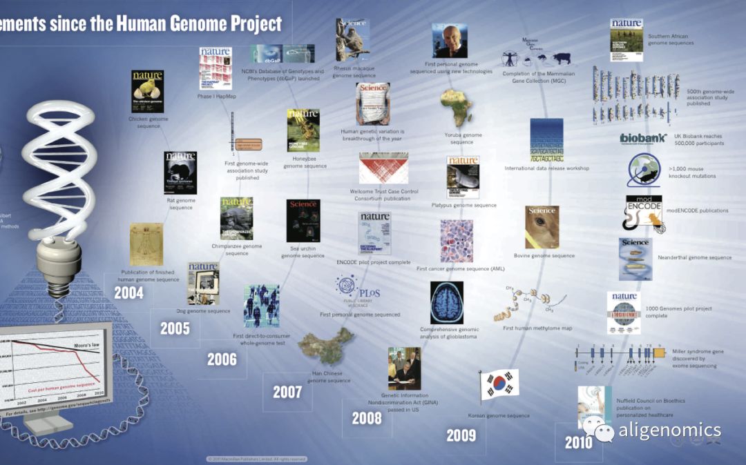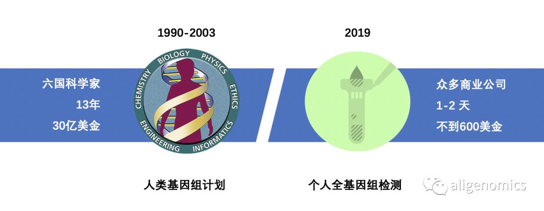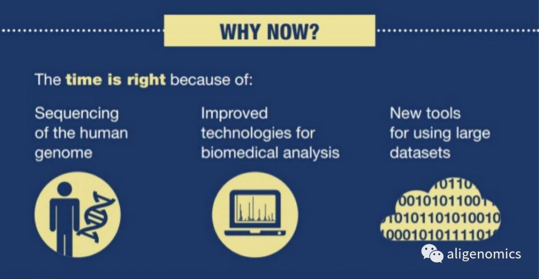 从1到1000,从1000到百万从1900年孟德尔遗传定律被重新发现,到摩尔根的连锁和交换定律,再到1953年沃森(James D. Watson)和克里克(Francis Crick)发现DNA双螺旋结构,在不远的近现代科学史中,人们逐渐揭开自然界丰富多彩生物多样性背后的遗传与演化规律,建立了一套完整的学科体系。所有物种都有共同的起源,个体随机产生变异信息,通过定向的自然选择作用,再稳定遗传给下一代,以适应不断变化的外界环境,并由此进化出地球上所有的生命,包括人类。基因,作为整个遗传过程的基本单元,本质上就是一段具有功能性的DNA或者RNA的序列,它存储着生命体的所有信息,与我们每个人的生老病死都息息相关。 人的基因信息,是一本“无字天书”,我们要读懂这一本书,首先要知道书中的每个字是什么。不仅如此,我们还需要能够这些字连起来,知道每一句话是什么意思。这样才有可能真正了解生命的奥秘。基因测序技术,就是弄懂DNA序列的排布情况。1990年开始,由包含中国在内的六国科学家们,用10年时间,花费30亿美金来破译人类的遗传信息。2000年6月26日,美国总统克林顿与英国首相布莱尔共同宣布人类基因组计划工作草图完成,2001年2月,工作草图的具体序列信息、测序所采用的方法以及序列的分析结果被国际人类基因组测序联盟和塞雷拉基因组的科学家分别公开发表于《自然》与《科学》杂志。 但是人类基因组测序还不能算是“完成”了,部分区域序列还无法进行测序。同时,单个的参考基因组也不能代表所有人群的遗传特点。在完成第一个人类基因组测序工作后,2007年,第一个黄种人的基因组;2008年,千人基因组计划也都相继启动和完成。科学家们从1到1000,继续在探索人类基因遗传的奥秘。2010年,英国科学家宣布UK10K项目,希望通过1万人的基因序列和个人健康信息结合,来更好理解低频的基因突变与人类疾病之间的关联关系。这也是之后各国大型人群的基因组学研究的一个通用思路,如何从百万级别的基因和表型数据中,去发现更多的疾病发生机理,诊断方法和治疗措施。 精准医学计划与“全民”基因组时代 从重大事件的时间进程来看,基因组学是一个完全崭新的前沿领域。DNA理论发现60多年,测序技术发明40多年,以高通量,低成本的NGS测序技术为代表的商业应用可能才10多年的时间。DNA测序的价格从人类基因计划时的30亿美金,到现在低于600美金一个人。测序技术的进度,不仅帮助基础科学继续前进,也催生了基因组医学研究和应用的快速发展。 2016年,时任美国总统的奥巴马宣布了精准医疗计划(Precision Medicine Initiative),该计划致力于治愈癌症和糖尿病等疾病,目的是让所有人获得健康个性化信息。2月8日,白宫官网发布了精准医疗计划的相关细节。该计划将加快在基因组层面对疾病的认识,并将最新最好的技术、知识和治疗方法提供给临床医生,使医生能够准确了解病因、针对性用药。同年,我国科技部也发布了“精准医学研究”国家重点专项,以我国常见高发、危害重大的疾病及若干流行率相对较高的罕见病为切入点,实施精准医学研究的全创新链协同攻关,构建百万人以上的自然人群国家大型健康队列和重大疾病专病队列。 进入2019年,这一趋势更加明显。9月11日,英国政府宣布与四家全球领先制药公司及一家慈善机构达成战略合作,将共同提供2亿英镑巨额资金,支持对英国生物生物样本库(UK Biobank)共计50万名参与者的全基因组测序项目。该项目将探索基因如何与人类生活方式及生活的环境相结合从而导至疾病,并旨在通过遗传学研究改善人类健康状况,并为全球科学界了解、诊断、治疗以及预防癌症、心脏病、糖尿病、关节炎、痴呆以及慢性肾病等重大疾病提供宝贵的数据资源,最终推动全球个体化医学的发展。12月10号,阿联酋更是公布了全球最全面的全民基因组计划——“阿联酋全民基因组计划”,目标是运用大规模人群基因组数据,为阿联酋人民建立可预测、可预防和个性化治疗的全民医疗卫生体系。 写在2020年,展望未来10年,“全民”的基因组时代正在加速到来,它必然将全方位的加深我们对于生命科学的理解,为人类疾病的预防、诊断和治疗提供全新的技术手段,诞生一个庞大的生命经济产业。根据统计,全球用于罕见病,癌症的全基因组测序的样本数,在未来几年内可能很快就超过10亿级别的规模。这对于任何从事这一领域的科学家、研究机构、政府和企业来说,面临行业的浪潮,都是巨大的机遇,也必然是巨大的挑战。 除了测序,我们还需要什么样的能力 美国的精准医学计划的介绍材料中,对于项目的背景做一个解释说明。为什么是现在,我们可以开展百万人规模的大型基因组研究项目。其中提到了三个必要条件,也可以从侧面来回答我们哪些是需要去解决的问题: