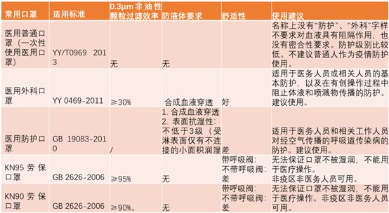 医用外科口罩 医用口罩属于第二类医疗器械,必须取得药品监督管理局颁发的注册证才可销售。其标签上必须注明注册证编号。 医用口罩包括医用普通口罩(一次性使用医用口罩)、医用外科口罩和医用防护口罩。分别执行YY/T 0969-2013《一次性使用医用口罩》、YY 0469-2011《医用外科口罩技术要求》和GB 19083-2010《医用防护口罩技术要求》。 按照各类医用口罩符合的标准和重要技术指标要求,医用防护口罩适用于医务人员和相关工作人员对经空气传播的呼吸道传染病的防护,防护等级高; 医用外科口罩适用于医务人员或相关人员的基本防护,以及在有创操作过程中阻止血液、体液和飞溅物传播的防护; 普通医用口罩对致病性微生物的防护作用不确切,可用于普通环境下的一次性卫生护理,或者致病性微生物以外的颗粒如花粉等的阻隔或防护。 劳保口罩 劳保口罩符合GB 2626-2006《呼吸防护用品 自吸过滤式防颗粒物呼吸器》标准,口罩罩体滤除颗粒物的能力,数值越大,防护等级越高,呼吸阻力也大。如95级为最低过滤效率为95%,99级最低过滤效率为99%,100级最低过滤效率为99.97%。按照过滤元件的过滤效率水平,分为KN90,KN95等。 此类口罩在我国不属于医疗器械,因此不能在医疗机构使用。但是从下文的详细介绍来看,非疫区的普通人使用符合GB 2626 KN95、KN90劳保口罩也是可以的。 一看标签上是否有医疗器械注册号。 二看执行标准 —— 执行GB19083-2010的是N95医用防护口罩,执行YY 0469-201是医用外科口罩。执行GB 2626-2006标准则是劳保口罩。执行YY/T 0969-2013标准的是一次性使用医用口罩,防护性能不好,不建议使用。 三看名称:医用防护口罩通常名称上有“医用防护”字样;医用外科口罩名称上常有“医用外科”字样。 口罩上通常有N、KN或FFP字样,这些字母分别指的是不同国家对口罩过滤效率的标准划分,口罩上标注的KN是中国的标准,N代表采用的是美国标准,FFP是欧洲标准。 KN是中国标准,它的检测手法和美国是一样的,按照我国GB2626-2006标准,口罩分为KN类和KP类,KN是指口罩适用于过滤非油性颗粒物,KP是指口罩适用于过滤油性和非油性颗粒物。字母后面的数字则代表口罩的防护等级,数字越大,防护等级越高。常见的口罩里还有一种是KN90的,就是指对0.3微米的颗粒物至少能挡住90%。这个比KN95略低一些,也还行。 N是美标口罩,由美国国家职业安全卫生研究院(NIOSH)对口罩的滤网材质和过滤效率进行分级。N95口罩对非油性颗粒的过滤效率须达95%以上与国标的KN95要求类似。 FFP是欧标口罩,欧标口罩符合欧盟标准委员会呼吸防护装具认证标准。根据测试的固态粒子防护滤材粒子穿透率分为P1 (FFP1),P2 (FFP2),P3 (FFP3)三个等级,FFP1最低过滤效果≥80%,FFP2最低过滤效果≥94%,FFP3最低过滤效果≥97%。 从非油性颗粒过滤效率来看,KN95近似于N95,近似于FFP2。 YY 0969标准没有对非油性颗粒过滤效率的要求。一般无法保证对细菌、粉尘的过滤性,在医院中一般用于常规护理,主要作用是阻隔医护人员与患者之间的日常交叉污染,并没有特别高的要求。如果大众人群使用,也就是拿来挡挡口臭,装装样子,防护的实际效果不是很理想。不建议疫情防控使用。 注意:如果在网站购买口罩一定要擦亮眼睛!好多宝贝标题写的是医用外科,实际上只是普通医用口罩。一定要查看其产品名称是否有“外科”或“防护”字样。若无法辨别,可以索要其注册证号,使用NMPA国家药品监督管理局医疗器械注册证数据库查询http://qy1.sfda.gov.cn/datasearchcnda/face3/base.jsp?tableId=26&tableName=TABLE26&title=%E5%9B%BD%E4%BA%A7%E5%99%A8%E6%A2%B0&bcId=118103058617027083838706701567。输入口罩包装上标注的注册证编号,查询其对应的注册证名称及预期用途。注册证名称写着普通医用口罩的不建议使用。 医用外科口罩主要用于医院的手术、置管等侵入性操作,感控重点监控部门也一般要求使用这类口罩。购买时注意包装上名称应有“外科”字样。 YY0469对外科口罩有细菌过滤性能的要求,一般对非油性颗粒的过滤效率应达到30%以上,对细菌的过滤效率要达到95%以上(注意,这里不是N95的意思,不要和医用防护口罩混淆)。此外医用外科口罩不光要考虑过滤效率的问题,还要考虑血、脓直接喷上去的情况,也就是说要防水(测试中是用人工合成的模拟血液) 。医用外科口罩(YY 0469)中有一项性能指标是“合成血液穿透”。因此,医用外科口罩一般分为三层,最外层为防液体飞溅。由一种或多种对病毒气溶胶、含病毒液体等具有隔离作用的面料加工而成的口罩。在呼吸气流下仍对病毒气溶胶、含病毒液体等具有屏障作用。戴在医疗机构与病毒物料接触的人员面部,用于防止来自患者的病毒向医务人员传播。 医用防护口罩对0.3μm非油性颗粒过滤效率不低于95%。即符合N95(或FFP2)及以上等级。口罩的过滤效率越高,对呼吸的阻力也就越大。所以舒适性不佳,勿长时间佩戴。。 此外,医用防护口罩有阻隔液体喷溅功能的需要,和YY 0469-2011的医用外科口罩一样,GB 19083也提出了“合成血液穿透”的要求,而且还多了一个“表面抗湿性”的参数要求,明确了医用防护口罩对血液体液等液体的防护效果,而这些都是GB 2626劳保口罩所没有的。 因此医用外科口罩外表面有一层疏水防护层,主要作用是可以防护轻微的液体或血液的飞溅渗透。而普通的劳保N95口罩是没有这层疏水防护层的