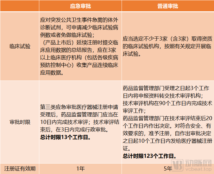 根据上述《办法》和《程序》,我们梳理出了第三类体外诊断产品应急审批和普通审批的主要差异: