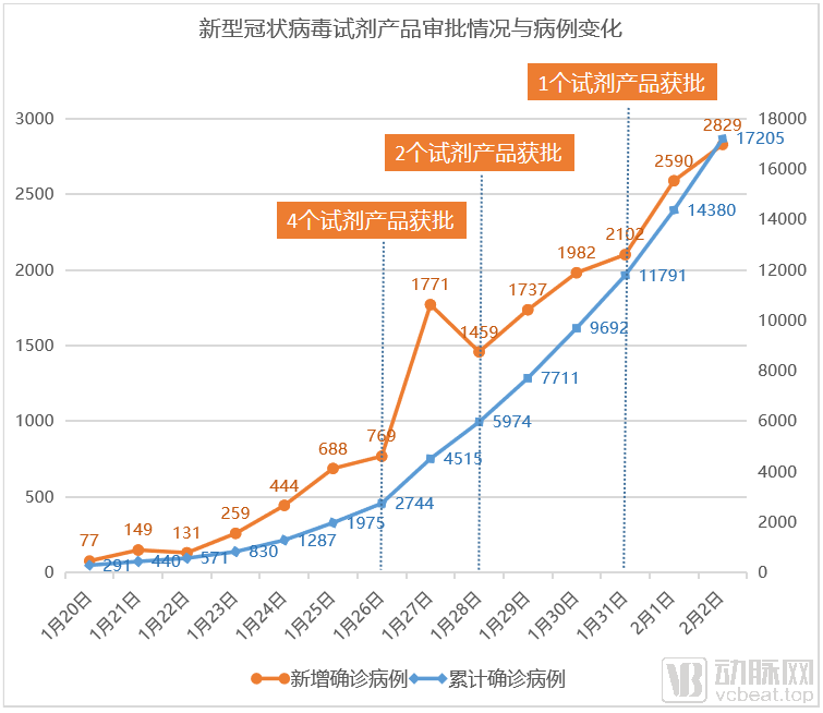 如上图所示,确诊人数的增长节点与试剂产品的获批节点呈同步状态。