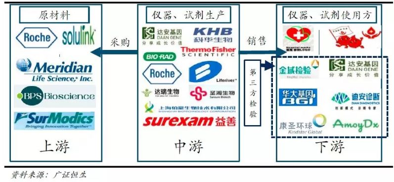 目前,艾克韦、万孚生物、硕世生物、优思达生物、辉睿生物、热景生物、绍兴同创等多家公司已完成新型冠状病毒检测试剂的研制,目前正组织人员进行产品的临床验证和注册申报工作,后续尚需向国家药品监督管理局提交注册申请。2月3日,国新办表示目前诊断试剂日产已达77.3万人份。尽管如此市面上有越来越多的试剂盒将用于疫情诊断,但专家反映当下试剂盒产能仍然满足不了疫情需要,一方面由于春节假期人手不够,另一方面,国内的分子诊断试剂盒原料,包括诊断酶、引物、反转酶、探针等生物制品,高纯度氯化钠、无水乙醇等精细化学品以及提取介质材料被国外巨头垄断,主要包括Roche、Thermofisher﹑Toyobo﹑Meridianlifescience、Solulink、Surmodics等巨头。值得一提的是,并非有了检测试剂盒,医院就可以开展病毒检测。目前获批的试剂盒大多为荧光PCR法,需使用PCR仪器在PCR实验室中进行检测。因此除上游原材料之外,中游的检测仪器也成为至关重要的一环。目前核酸提取仪﹑基因扩增仪﹑二代测序仪基本实现国产化生产。核酸提取仪的国内生产厂家主要有科华生物qixia的苏州天隆,达安基因﹑硕世生物﹑无锡百泰克﹑杭州博日等。二代测序仪和测序试剂盒国内厂家主要有华大智造﹑艾德生物﹑吉因加﹑泛生子﹑燃石医学﹑诺和致源等。新型冠状病毒虽然不像以往如禽流感之类的其他传染性病毒一样,需要先培养病毒后再检测,现在可以采用核酸检测这样的快速检测方式,但检测下来也需要花费几个小时;样本从医院采集,到疾控中心检测,也需要大半天时间才检测完成。允许与第三方检测机构合作,无疑可以大大提高检测效率。我国独立医学实验室有近二十年的发展历史,常规检测项目在独立医学实验室占有比重超过50%。对于缺乏场地、技术装置和人员的基层社区卫生服务中心和基层医院,独立医学实验室参与这次疫情站可以有效缓解大型医院和疾控中心的压力,在社区医院取样后运送各地中心实验室进行检测。然而,由于冠状病毒与常规样本不同,对于第三方的标本运输、分装与保存﹑以及防护污染措施提出了新的要求。