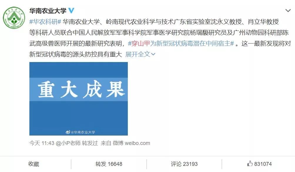 新型冠状病毒到底是如何从野生动物传到人的身上的? 2月7日,华南农业大学对外发布消息称,华南农业大学、岭南现代农业科学与技术广东省实验室沈永义教授、肖立华教授等科研人员联合中国人民解放军军事科学院军事医学研究院杨瑞馥研究员及广州动物园科研部陈武高级兽医师开展的最新研究表明,穿山甲为新型冠状病毒潜在中间宿主。 上述的研究者之一,沈永义目前主要从事分子病毒生态学,进化基因组学,生物信息学的研究,目前承担的科研项目有三个,分别是禽流感病毒进化生物学、华南地区主要野生动物携带病毒谱调查研究、蝙蝠独特暗视觉系统的分子遗传机制研究,其中,前两个项目还在研究当中,第三个已结题。 新型冠状病毒属于β属的新型冠状病毒,有包膜,颗粒呈圆形或椭圆形,常为多形性,直径60~140nm。其基因特征与SARSr-CoV和MERSr-CoV有明显区别。目前研究显示与蝙蝠SARS样冠状病毒(bat-SL-CoVZC45)同源性达85%以上。 在2月7日的发布会上,华南农业大学校长刘雅红介绍称,通过分析1000多份宏基因组样品,锁定穿山甲为新型冠状病毒的潜在中间宿主;继而通过分子生物学检测,揭示穿山甲中β冠状病毒的阳性率为70%;进一步对病毒进行分离鉴定,电镜下观察到典型的冠状病毒颗粒结构;最后通过对病毒的基因组分析,发现分离的病毒株与目前感染人的毒株序列相似度高达99%,以上结果表明穿山甲为新型冠状病毒的潜在中间宿主。研究结果对本次疫情的源头防控具有重大意义,也对野生动物管控的相关政策调整提供科学依据。 “新型冠状病毒疫情爆发后,对于病毒潜在发生过程,大家对有可能的动物来源都比较感兴趣。最初,病毒是源于蝙蝠,从蝙蝠又怎样传到人的身上?中间的宿主是谁?过去SARS病毒的中间宿主是经过果子狸;埃博拉病毒则被认为是通过骆驼。现有的研究显示,新型冠状病毒有可能是来源于野生动物,原因在于早期发现的病例,都有华南海鲜市场接触史。这个市场也被检出该病毒。而这个市场除了卖海鲜外,还有其他动物。围绕冠状病毒溯源,我们开展了溯源工作,我们通过对多种动物进行了分析,最后锁定穿山甲为新型冠状病毒的潜在中间宿主。我们这一结果有利于阻断病毒动物源,避免病毒的长期传播,促进新型冠状病毒的源头防控。”肖立华说道。 值得一提的是,关于新型冠状病毒的中间宿主问题,在此之前也有其他讨论。 如来自于北京大学工学院教授朱怀球团队在bioRxiv预印版平台发表“深度学习算法预测新型冠状病毒的宿主和感染性”一文中指出,蝙蝠和水貂可能是新型冠状病毒的两个潜在宿主,水貂可能是中间宿主。 再如北大另一中国科研团队的一篇发表在《医学病毒学》杂志上的论文也指出,将新型冠状病毒的中间宿主锁定为蛇。该文章通过对新型冠状病毒的基因序列进行研究,发现该病毒的一段基因组发生了同源重组,为了寻找这段同源重组的基因组到底来自于哪个动物,研究组对武汉海鲜市场常见的一些动物,包括蛇、鸡、穿山甲、蝙蝠和旱濑等的基因密码都测了一遍,最后得出结论认为蛇是最有可能的中间宿主。 “鉴于当前疫情防控的严峻性,我们选择将研究结果在第一时间向社会公布,希望有助于疫情的科学防控,并为更多科学家开展进一步工作提供借鉴。”刘雅红表示。 潜在“中间宿主”背后的非法贸易穿山甲为国家二级保护动物。据不完全统计,20世纪60年代至今,我国野生穿山甲的数量已经下降了88.88%至94.12%。我国华南地区原有的穿山甲分布区,至少有50%以上已成为罕见或濒危绝迹的地区。 有专家介绍,目前,国内的穿山甲种群已商业性灭绝,国际上非法贩卖的穿山甲,大部分是为了满足亚洲消费者的食用和药用需求。 据国家林草局森林公安之前提供的情况通报,在我国,穿山甲被禁止违法捕杀和食用。然而在利益的驱使下,仍有人仍铤而走险,甚至将穿山甲做成私房菜。 穿山甲被禁止违法捕杀和食用。资料来源:森林公安 据第一财经记者了解,为加强对穿山甲的保护,我国已于2007年停止一切从野外猎捕穿山甲活动,并从2018年10月起全面停止商业性进口穿山甲及其制品。 国家林草局也通过打击野生动植物非法贸易部际联席会议制度,开展专项打击行动等加大对破坏野生动物资源犯罪的打击力度。 2019年8月,在穿山甲救护专家座谈会上,有关方面表示,正研究将穿山甲由国家二级保护野生动物提升至国家一级予以保护。 |