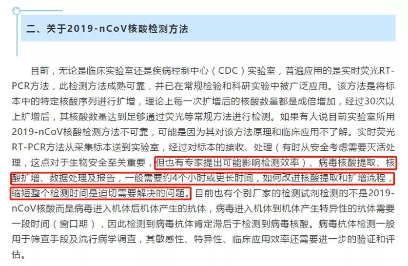 文章第二段,王成彬主任对实时荧光RT-PCR方法发表了绝对的肯定。王成彬主任写到:“目前,无论是临床实验室还是疾病控制中心(CDC)实验室,普遍应用的是实时荧光RT-PCR方法,此检测方法成熟可靠,并已在常规检验和科研实验中被广泛应用。”王成彬主任随后提到这个检测方法的主要问题为前处理以及数据处理的时间过长。