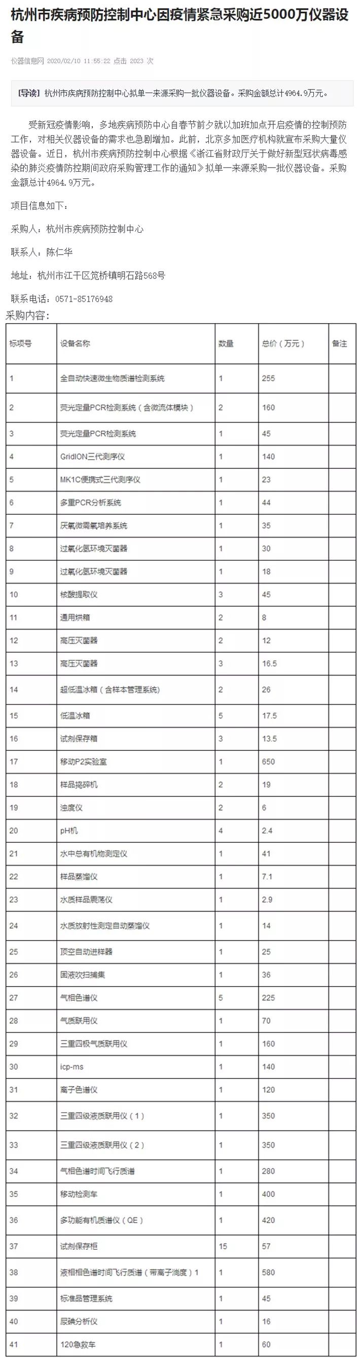 当然了,目前质谱针对病毒的检测国内还处于初步阶段,肯定会遇到很多问题,比如自动化普及程度低、入门门槛高等等,这些还需要相应的厂家和机构的努力。昨天,编者看到仪器信息网发布一篇名为《杭州市疾病预防控制中心因疫情紧急采购近5000万仪器设备》的文章,其采购内容引起了我的兴趣。