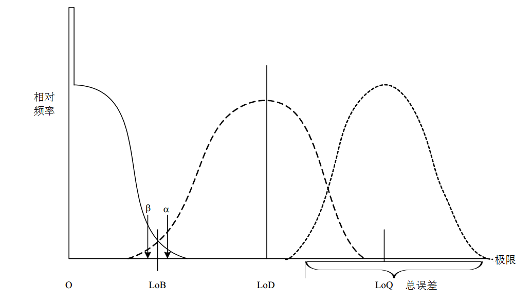 注:以上限值具有LOB<LOD≤LOQ的关系,三者关系如下图所示。
