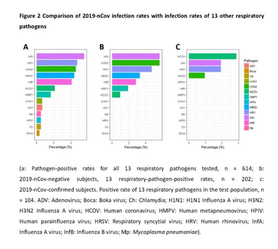 背景: 快速准确诊断2019-nCoV感染的患者和携带者,是预防和控制该病流行的关键。因此,快速准确的2019-nCoV临床检测方法尤为重要。CDC建议使用带有特异性引物和探针的特异性实时RT-PCR方法检测2019-nCoV开放阅读框(ORF1ab)和核蛋白(N)基因区域,如果两个标靶均为阳性,则患者被定义为实验室确认感染。 然而,在检测过程中,各种因素都会影响分析结果,造成假阳性或假阴性结果。这给临床诊断和疫情控制带来了困难。此外,2019-nCoV可能与其他病原体共同感染。因此,疑似2019-nCoV感染的患者也应通过其他检测方法进行评估,以筛选其他的呼吸道病原体。然而,目前尚无关于共感染病原体及其比例以及2019-nCoV感染的数据。 我们的临床实验室位于疫情中心,目前已检测到全球2019-nCoV感染的最大样本数;我们有8274例近期病例(2020年1月21日至2月9日)的信息,可用于分析2019-nCoV感染情况。评估2019-nCoV检测的实验室特征和2019-nCoV与其他病原体的共同感染情况,将为武汉等防疫和临床治疗提供参考。 因此,在这项研究中,我们评估了2019-nCoV的检测方法,以及与其他病原体的共同感染情况。 数据来源:对武汉大学人民医院2020年1月20日至2月9日8397名密切接触者是实验室检测结果进行评价。在8397名患者中,排除123名重新取样的患者,最后,8274名受试者被纳入分析。每名受试者的鼻咽拭子样本均由临床医生采集,并同时采集痰标本。在此期间,613名受试者接受了13种常见呼吸道病原体的多重测试(中位年龄51岁,31-63岁,49.5%为男性),316人还进行了2019-nCoV检测。研究设计经武汉大学人民医院伦理委员会批准。数据收集自常规临床实践,无需知情同意。 在8274份样本, 33.2%(2745份)为2019-nCoV, 63.8%(5277份)检测为2019-nCoV阴性,尚有252名患者(3.0%)由于只有一个靶基因呈阳性,暂未明确诊断。 2019-nCoV检测阳性组、2019-nCoV检测阴性组和暂未明确诊断组的中位年龄分别为56岁(42-67岁)、40岁(30-57岁)和52岁(35-64岁)。Dunnett检验显示,2019-nCoV检测阴性组的年龄低于2019-nCoV阳性组(t=-20.724,p<0.001)和暂未确定组(t=-4.251,p<0.001),而2019-nCoV阳性组与暂未确定组年龄差异无统计学意义(t=-2.218,p=0.052) 2019-nCoV阴性组中,第一次评估时有一例仅nCoV-NP标靶呈阳性,而在第四天重新取样和重新评估后,2019-nCov-ORF1ab和2019-nCoV-NP均呈阴性。1例2019-nCov-ORF1ab在首次评估时呈阳性,而nCoV-ORF1ab和nCoV-NP在第3天重新取样和重新评估后均呈阴性。