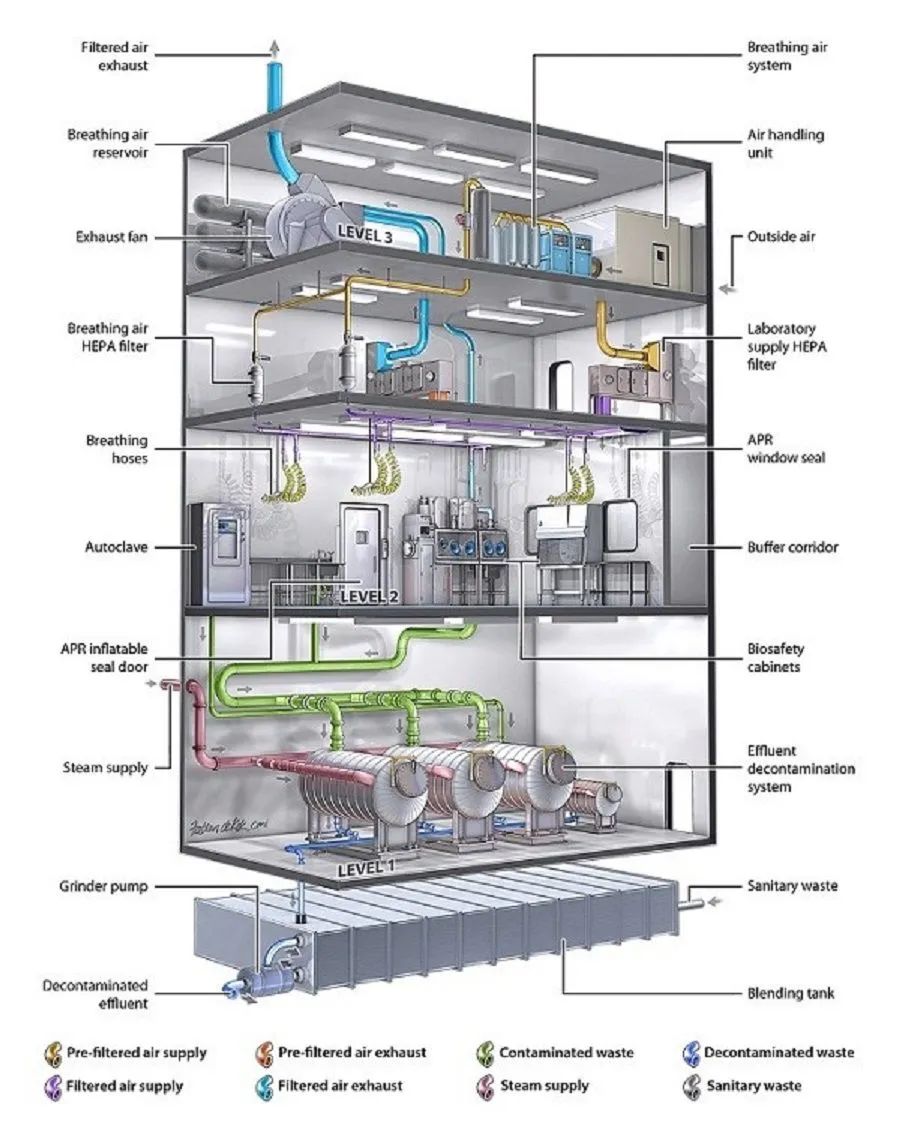 在1月22日疾病预防控制局发布的《新型冠状病毒感染的肺炎防控方案(第二版) 》 中,向相关部门提供了《新型冠状病毒感染的肺炎实验室检测技术指南》。 1月23日国家卫健委又印发新型冠状病毒实验室生物安全指南(第二版)的通知。 1月30日,国家卫健委正式批准复旦大学三级生物安全防护实验室(简称“P3实验室”)开展新型冠状病毒实验活动。 新冠病毒的快速传播、病毒检测结果、一次次地把实验室带入人们的视线。不光医务和救援工作者在前线全力救治,科研人员也在紧锣密鼓地进行病毒研究以及药物实验。 那你可能想知道,进行病毒实验的实验室是什么样子?与学校里的生物实验室、医院里的检测实验室有什么不同呢?进行病毒实验的实验室是什么样子?与学校里的生物实验室、医院里的检测实验室有什么不同呢?接下来,让我们一起认识一下生物安全实验室。接下来,让我们一起认识一下生物安全实验室。 什么是生物安全实验室? 实验室是进行科研工作的必需场所,根据危险度等级,包括传染病原的传染性和危害性,国际上将生物实验室按照生物安全水平(Biosafety level,BSL)分为P1(Protection level 1),P2,P3和P4四个等级。 P1-P4实验室可以承担的工作也根据安全等级进行划分,其严格等级从低到高。 P1实验室:基础实验室,适合对人体、动植物或环境危害较低,不具有对健康成人,动植物致病的因子。 P2实验室:基础实验室,适用于对人体、动植物或环境具有中等危害或具有潜在危险的致病因子,对健康成人、动物和环境不会造成严重危害,有有效的预防和治疗措施。 P3实验室:防护实验室,适用于处理对人体、动植物或环境具有高度危害性,通过直接接触或气溶胶使人传染上严重甚至是致命的疾病,或对动植物和环境具有高度危害的致病因子,通常有预防和治疗措施。 P4实验室:最高级别防护实验室,适用于对人体、动植物或环境具有高度危害性,通过气溶胶途径传播或传播途径不明,或未知的、高度危险的致病因子。没有预防和治疗措施。比如埃博拉病毒。 生物安全实验室的建设需要遵照已发布的《生物安全实验室建筑技术规范》。根据规范,P2实验室宜实施一级屏障和二级屏障,而P3和P4实验室需要设置一级屏障和二级屏障。 一级屏障保障了实验操作者与被操作对象之间的隔离,包括生物安全柜和正压防护服等; 二级屏障则是保障了生物安全实验室与外部环境的隔离,其中就包括换气系统,因此,一级屏障和二级屏障分别是实验人员和外界环境的保护伞。 建筑技术规范中也详细制定了P3和P4等级实验室的主要房间,包括主实验室,主实验室缓冲间,隔离走廊,防护服更换间,准备间,淋浴区等的技术指标。 超高的清洁级别,恒定范围的温度、湿度以及压差都是实验安全的保证。 生物安全实验室二级屏障的主要技术指标 来源: 生物安全实验室建筑技术规范 GB 50346-2011 你可能会好奇,最高级别的P4实验室具体是怎样的呢? P4实验室作为最高级别的生物安全实验室,是应对高危险性、且无法预防和治疗的烈性病毒的利器。 P4实验室一般为一栋独立的建筑物,如与其他级别生物实验室共用建筑物,也需要在建筑物中占据独立的隔离区域,并与附近的其他建筑物完全隔离。 在常见的四层结构中,一层为污水处理与保障设备,二层为核心实验区,三层为排风管道过滤层,四层为空调设备与送排风管道。 P4实验室的基本特征 来源:National Institutes of Health, part of the United States Department of Health and Human Services 生物安全实验室中的人员保护 进入普通实验室时,实验人员仅需实验服,手套和面部防护等装备。而高等级实验中有潜在的危险致病因子,研究人员要怎样保护自身呢?