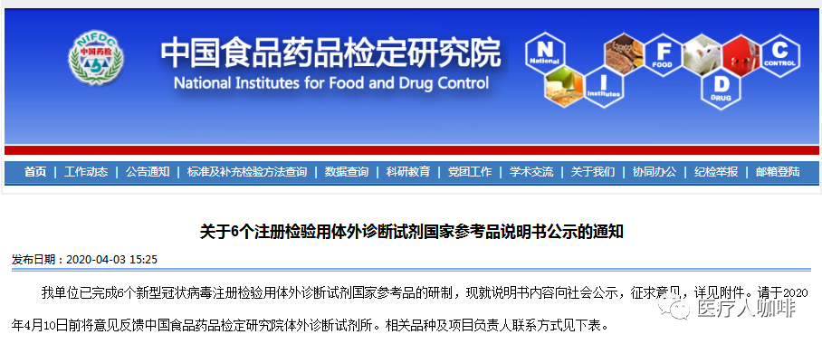 | 我单位已完成6个新型冠状病毒注册检验用体外诊断试剂国家参考品的研制,现就说明书内容向社会公示,征求意见,详见附件。请于2020年4月10日前将意见反馈中国食品药品检定研究院体外诊断试剂所。相关品种及项目负责人联系方式见下表。 来源:中国药检 |