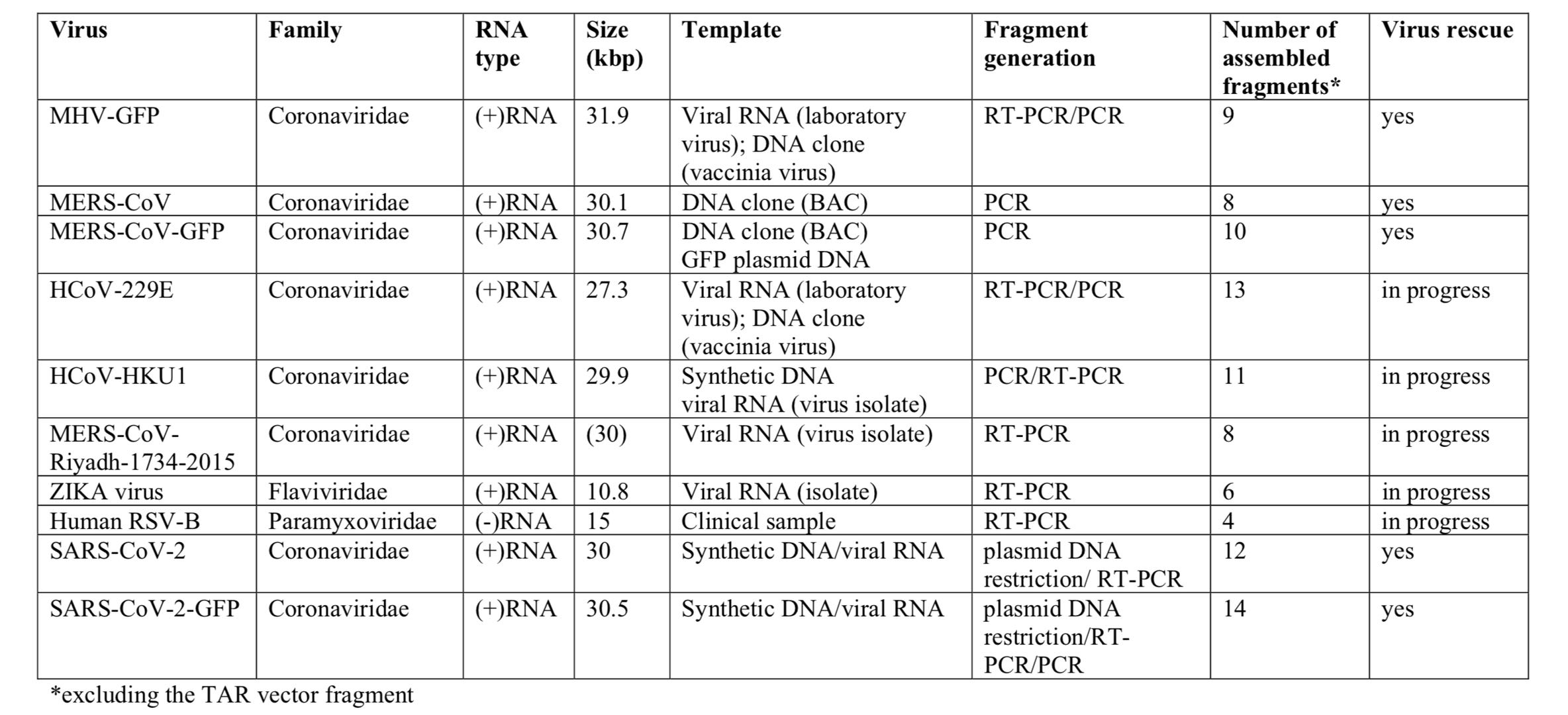 酵母中转化偶联重组DNA 研究者将反义DNA拆解成12个长0.5-3.4 kbp具有重叠末端序列的DNA片段,并引入GFP(绿色荧光蛋白序列),利用酿酒酵母中的同源重组系统,使得反义DNA在酵母菌中重组成完整的基因序列。之后,在体外,用T7 RNA聚合酶将反义DNA转录成为有感染性的病毒RNA。通过电穿孔将RNA导入后,发现正常的VeroE6细胞能够被感染并发出荧光。