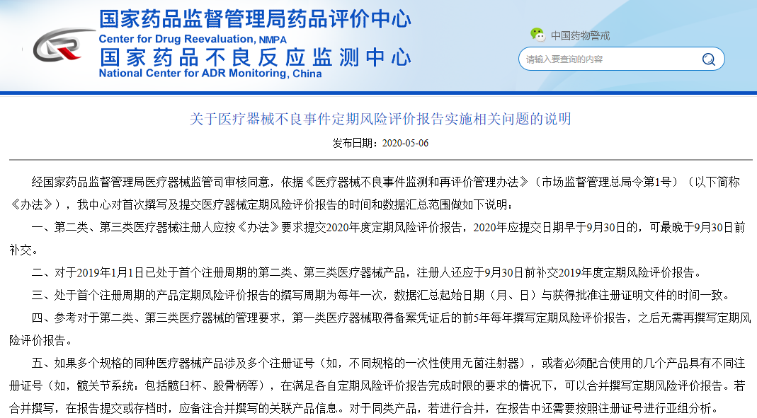 ▲关于医疗器械不良事件定期风险评价报告实施相关问题的说明(来源:不良反应监测中心) 经国家药品监督管理局医疗器械监管司审核同意,依据《医疗器械不良事件监测和再评价管理办法》(市场监督管理总局令第1号)(以下简称《办法》),我中心对首次撰写及提交医疗器械定期风险评价报告的时间和数据汇总范围做如下说明: 一、第二类、第三类医疗器械注册人应按《办法》要求提交2020年度定期风险评价报告,2020年应提交日期早于9月30日的,可最晚于9月30日前补交。 二、对于2019年1月1日已处于首个注册周期的第二类、第三类医疗器械产品,注册人还应于9月30日前补交2019年度定期风险评价报告。 三、处于首个注册周期的产品定期风险评价报告的撰写周期为每年一次,数据汇总起始日期(月、日)与获得批准注册证明文件的时间一致。 四、参考对于第二类、第三类医疗器械的管理要求,第一类医疗器械取得备案凭证后的前5年每年撰写定期风险评价报告,之后无需再撰写定期风险评价报告。 五、如果多个规格的同种医疗器械产品涉及多个注册证号(如,不同规格的一次性使用无菌注射器),或者必须配合使用的几个产品具有不同注册证号(如,髋关节系统:包括髋臼杯、股骨柄等),在满足各自定期风险评价报告完成时限的要求的情况下,可以合并撰写定期风险评价报告。若合并撰写,在报告提交或存档时,应备注合并撰写的关联产品信息。对于同类产品,若进行合并,在报告中还需要按照注册证号进行亚组分析。 |