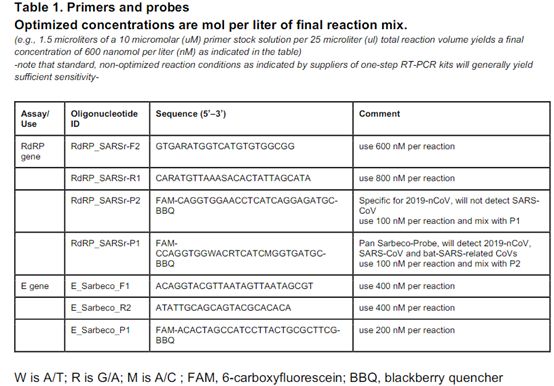 可以核酸提取和实时荧光RT-PCR反应体系参考相关厂家试剂盒说明。 2.结果判断 阴性:无Ct值或Ct为40。 阳性:Ct值<37,可报告为阳性。 可疑:Ct值在37-40之间,建议重复实验,若重做结果Ct值<40,扩增曲线有明显起峰,该样本判断为阳性,否则为阴性。 实际上在2020年的1月17日,世界卫生组织就已经发布《Diagnostic detection of 2019-nCoV by real-time RT-PCR》,其中也公布了引物、探针的详情: 由此开始,包括生工生物在内的国内外大小Oligo合成公司,纷纷放弃了春节假期,加班加点生产上述引物和探针。截至2020年2月1日,生工生物已经累计生产检测用探针、引物共约720万人份,这些诊断原料被迅速发送给国内外大小诊断试剂盒公司,组装出的nCoV诊断试剂盒被迅速送往各地医院和相关检测诊断机构。 生工生物,以诊断原料的上游供应商身份,参与到了这场轰轰烈烈的战疫洪流中。 那么这小小的短短的探针,是如何在疫情诊断方面发挥巨大作用的? 用牺牲换来光芒——TaqMan探针法qPCR详解 Taqman探针法的检测原理 Taqman探针法荧光定量PCR,通过在常规的PCR体系中引入一条Taqman探针来进行实时荧光检测。这条Taqman探针是一条寡核苷酸,其能够结合到PCR正反向引物结合区域的内部,随着PCR反应的进行,DNA聚合酶在延伸到探针位置会将其水解,从而产生信号。因此Taqman探针属于水解探针的重要成员之一。 Taqman探针的5端标记有荧光基团,3端标记有相应的淬灭基团。由于Taqman探针长度的限制,当探针完整的时候,荧光基团处于淬灭基团的淬灭范围内,荧光大部分被淬灭基团吸收或转换为别的波长的光,此时仪器检测不到相应的荧光值。在PCR退火过程中,探针优先结合到待扩增区域,然后DNA聚合酶从引物位置开始延伸,一直延伸到探针位置,此时DNA聚合酶的5-3核酸外切酶能够将Taqman探针水解。水解之后,荧光基团脱离了淬灭基团的束缚,释放出强烈的荧光,从而被仪器检测到。 为什么能够定量? 由于在PCR体系中探针的添加是过量的,只要探针设计合理,体系中所有的模板都能跟相应探针相结合。因此,体系中的模板量越多,结合上去并被水解的探针就越多,荧光值的积累就越快,得到的相应Cq值就越小。 探针序列的设计原则 并不是任意一段序列都适合作为Taqman探针,其设计要掌握以下几个原则: 1. Tm值及长度 Taqman探针的长度最好在25-32bp之间,且Tm值在65-72°C之间,确保探针的Tm值要比引物的Tm值高出5~10°C,在退火过程中优先结合到模板上。 2. 探针的序列 ● 探针序列要与模板能够完全互补配对,探针尽量避免出现二聚体或者高级结构,以保证足够高的模板结合效率。 ● 探针的5端最好紧邻对应引物(结合同一模板链的那条引物)的3端,这样能够保证在PCR扩增时第一时间将探针水解释放荧光信号。 ● 探针两端的各两个碱基不能为G,即使单独的G碱基也会对荧光基团产生淬灭作用,从而影响荧光或者淬灭效率。 ● 整条探针中,碱基C的含量要明显高于G的含量,较多的G会产生高级结构,对探针的合成以及使用产生负面效果。 qPCR诊断如何操作? 小编用最简单的图示,简要介绍一下用探针法qPCR进行nCoV的诊断流程: 1. 样本提取 提取待检测者的生物样本中的RNA,通常是:上呼吸道标本:包括咽拭子、鼻拭子、鼻咽抽取物。下呼吸道标本:包括深咳痰液、呼吸道抽取物、支气管灌洗液、肺泡灌洗液、肺组织活检标本。血液标本:尽量釆集发病后7天内的急性期抗凝血。4.血清标本等。 使用RNA提取试剂盒,将其RNA提取出来。 2. 逆转录 由于提取出来的核酸数量极少,因此必须使用及其灵敏的手段将其扩增检测出来,PCR就是最佳选择之一,但PCR过程使用的酶是DNA聚合酶,其只能以DNA为模板进行扩增富集,因此在进行PCR之前,需要将提取出的RNA进行逆转录,使其变为反向互补的DNA(cDNA)。 3. qPCR检测 选用针对新型冠状病毒的ORF1ab、N基因区域的引物和探针试剂盒,对逆转录出的样本进行检测(某些试剂盒,为了节省时间防止污染,将逆转录和qPCR放在一个体系中进行)。 在退火过程中引物和探针能够结合到靶标cDNA上,引物结合上之后,在PCR酶的作用下进行延伸,当延伸至探针结合区域时,PCR酶的5-3核酸外切酶活性会将探针水解,从而造成荧光与淬灭基团分离,此时,水解掉的探针呈现明亮荧光,从而被qPCR仪侦测到,体现为一条S型扩增曲线。 探针法的特点 ●特异性高 相比于染料法荧光定量PCR,Taqman探针法通过探针的引入,极大提升了qPCR反应的特异性。即使引物有二聚体或者非特异性条带扩增,由于没有探针的参与水解,也不会产生荧光信号,不会对定量产生影响。 这也是为什么WHO和CDC公布的检测方法都是探针法。 ●适用于多重qPCR 探针法的另一个优点是可以做多重qPCR,能够同时检测多个指标的含量。在保证足够的扩增效率的情况下,有的研究者会将两套甚至更多引物和探针置于一个qPCR体系中,通过探针标记的荧光基团不同,分别检测相应的荧光信号变化。这样极大节省了qPCR酶的用量,降低了成本。并且某些检测,如SNP的探针法检测,是一定要使用不同的探针在统一体系下进行检测的。比如,将CDC公布的两套检测探针中使用不同的荧光基团标记,这样可以在一个反应体系中进行两个靶点的检测,这样极大节约了成本、时间,同时也增加了检出率。 对照很重要 在进行qPCR诊断检测过程中,对照组的意义重大,以下几个对照组是必不可少的: ● 阳性对照:排除实验失