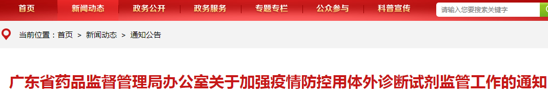 近日,广东省药监局发布一则《关于加强疫情防控用体外诊断试剂监管工作的通知》,(以下简称《通知》)。