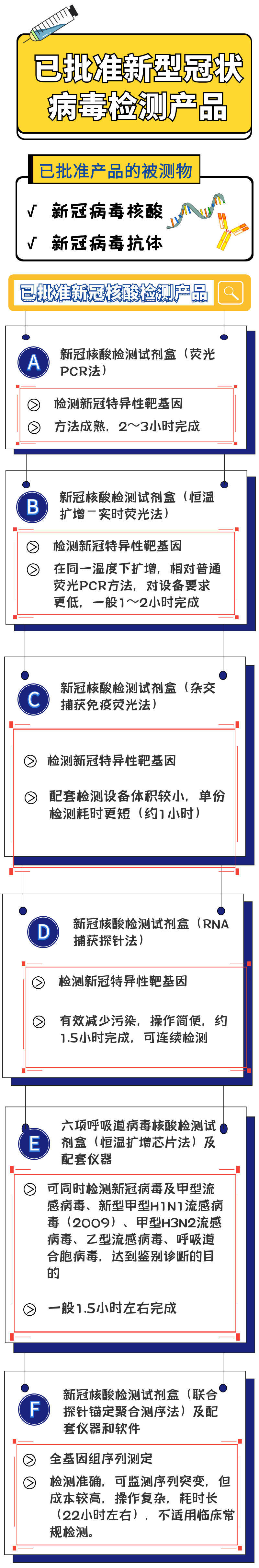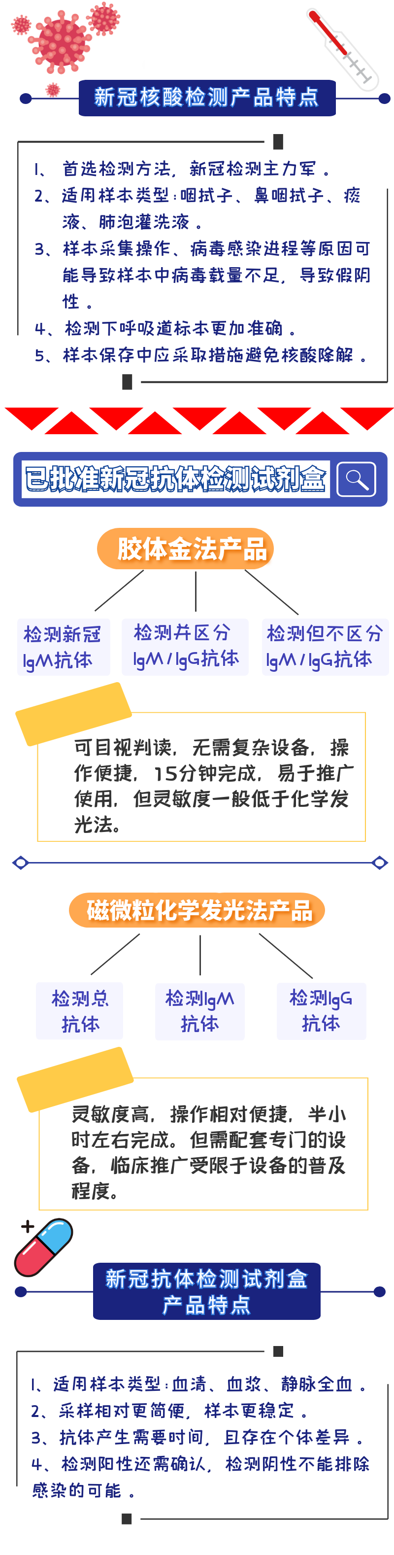 据统计,目前国内20家IVD企业22款新冠检测产品获得国家药监局批准注册上市,为防控疫情提供关键保障。这22款产品分为核酸检测和抗体检测两大类,那么这些产品有什么特点及用途呢?请看下图: