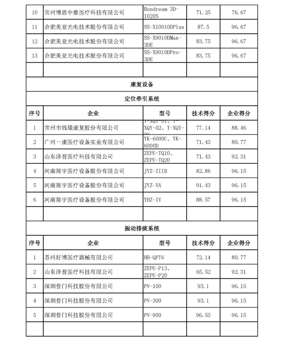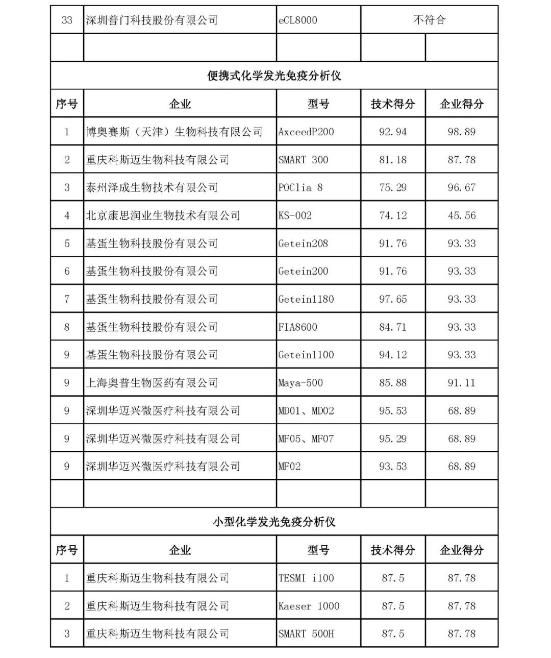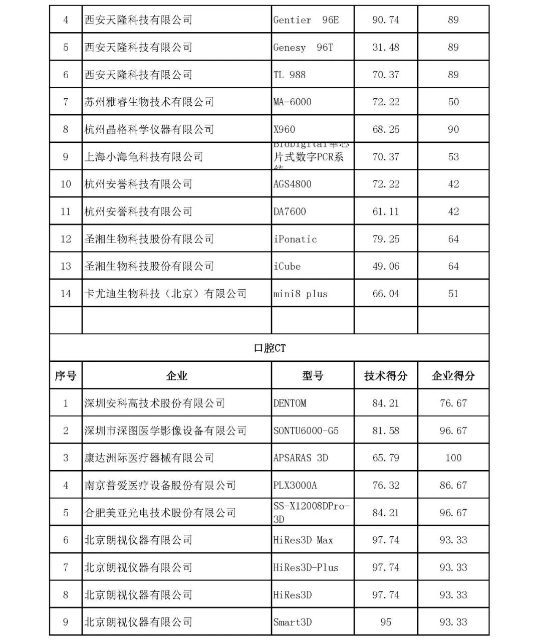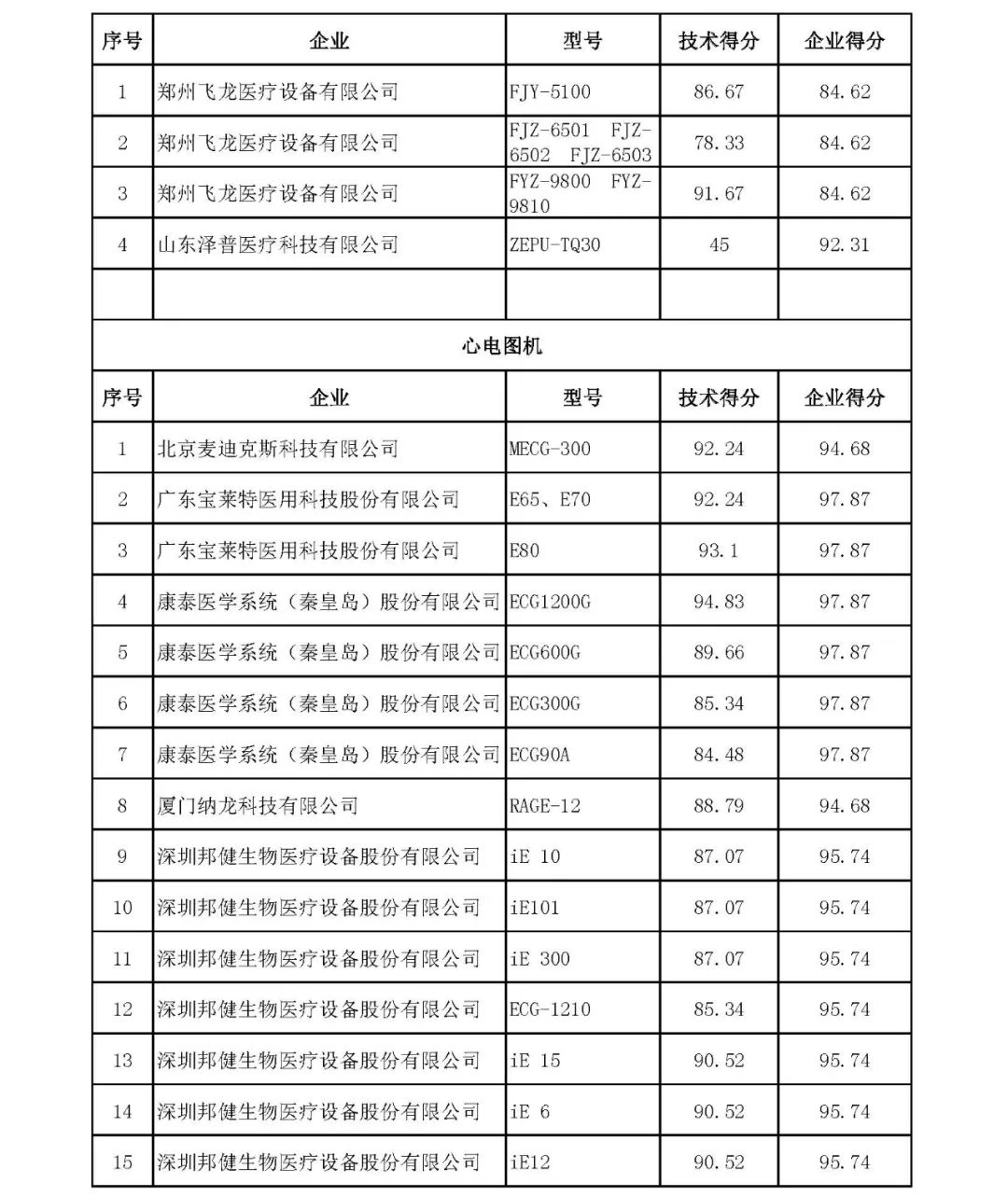 第六批优秀国产医疗设备产品遴选已完成部分品目的技术参数、企业情况评审工作。根据遴选公告要求,现将评审结果公示。 一、公示品目 化学发光免疫分析仪、全自动荧光定量基因扩增仪、口腔CT、康复设备、心电图机。 本次公示评审结果为百分制,合格分值为80分及以上。 二、公示时间 公示时间为2020年5月21日至2020年5月28日。 三、质疑 如有质疑(申诉),请在公示期内发送正式质疑(申诉)函件,内容包括质疑(申诉)条款、说明、佐证资料等并加盖公章,相关材料请发到邮箱15801485136@163.com。 四、联系方式 地 址:北京市海淀区知春路68号领航科技大厦 邮 编:100086 联系人:曾凯 赵小瑞 联系电话:010-88393651