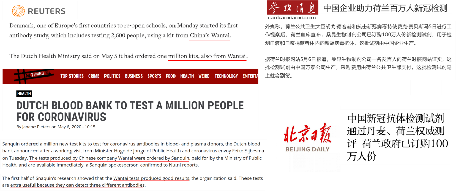 在荷兰国家公共卫生及环境研究院、国家采供血机构等进行了7,514人的预研究后(Research Square 2020),荷兰卫生部采购了万泰总抗体检测试剂用于荷兰国内的血清流行病学调查,并在荷兰国家电视台(NOS.nl)由副首相和卫生大臣对所采用的试剂和即将开展的流调工作进行了公告。 国内外主流媒体路透社、荷兰NL Times、参考消息、北京日报等多次报道了荷兰采购和使用万泰新冠总抗体检测试剂的情况 目前 厦大-万泰团队 基于三种抗体检测技术平台 研制出总抗体、IgM、IgG 共9种抗体检测试剂, 和基于RT-PCR技术平台 的1种核酸检测试剂
