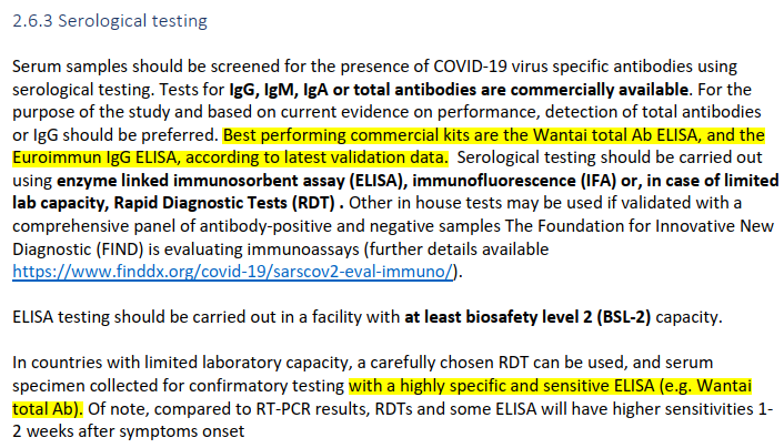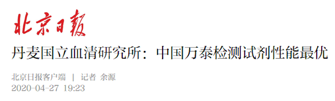 重磅消息! 5月26日 世界卫生组织(WHO)官网 发布了新冠血清流行病学调查方案 《基于人群年龄分层的COVID-19 感染血清流行病学调查方案》 方案明确指出 为了实现流调目标 应优先检测总抗体或IgG 而总抗体性能最优的检测试剂是 厦门大学和养生堂旗下万泰生物 联合研制的 万泰总抗体检测试剂! WHO优先推荐用于 世界各国血清流行病学调查 流调方案的制定对全球疫情的防控具有十分重要的意义。 方案包含背景、方法、数据分析、结果报告等模块,详细介绍了人群新冠血清学流调工作的全流程。 “接下来呈现的已经设计好的方案,是为了在任何一个报告了COVID-19病例的国家基于总人群血清阳性率来调查感染程度。每个国家可能需要根据本国的能力条件、可用的资源和文化适应性来调整该方案的一些方面,以便与本国的公共卫生、实验室和临床系统相适应。然而,使用一个如下所示的标准方案,有利于系统收集生物学样本和以一种能够很容易跨全球不同流行背景进行汇集、制表和分析的格式来快速共享流行病学暴露数据,从而及时用于估计COVID-19感染、严重程度和罹患率以及回应公众关切和政策制定。这在出现新呼吸道病原体的背景下,例如COVID-19,是特别重要的。” 在方法模块,方案对血清学检测试剂的选择作了细致阐述: “血清样品应该使用血清学检测试剂来开展COVID-19特异性抗体的筛查。目前,商业化的IgG、IgM、IgA和总抗体检测试剂已经上市。为了实现研究目标,基于当前的试剂性能证据,优先检测总抗体或IgG。根据最新的验证数据,性能最优的商业化试剂盒是万泰总抗体检测试剂(酶联免疫法)和欧蒙IgG抗体检测试剂(酶联免疫法)。” “在实验室条件有限的国家,可以选用经过严格选择的快速检测试剂,并且收集血清样本,进而用高特异性和高灵敏度的酶联免疫法检测试剂(例如万泰总抗体检测试剂)进行验证。值得注意的是,相较于RT-PCR的检测结果,快速检测试剂和一些酶联免疫法检测试剂在出现症状后1-2周的患者中拥有更高的灵敏度。” 中国检测试剂质量不行? 国外官方机构给予最优评价 事实上 对厦大-万泰新冠检测试剂 质量的认可 WHO不是唯一一个 此前,在丹麦、荷兰、奥地利、捷克等国的官方机构对来自多个国家的抗体检测试剂进行的对比评价中,厦大-万泰团队研制的总抗体检测试剂均表现出最好的检测性能! 丹麦国立血清研究所的对比研究表明万泰总抗体检测试剂整体检测性能优于来自美国、德国、加拿大、中国的其他8种抗体检测试剂。(medRxiv 2020.04.09) 北京日报关于丹麦评价研究的报道 荷兰鹿特丹伊拉斯姆斯医学中心、拉德布德大学、国家公共卫生及环境研究院的对比研究显示万泰总抗体检测试剂在来自中国、美国、德国、意大利的11种抗体检测试剂中性能最优。(medRxiv 2020.04.23) 荷兰国家电视台(NOS.nl)画面中 的万泰新冠总抗体检测试剂 捷克最有影响力之一、 发行量第二的报刊 《捷克今日报》在报道中提及 万泰总抗体检测试剂的 特异性和灵敏度 在26,500人的应用中 是令人非常满意的! 《捷克今日报》(www.idnes.cz) 关于新冠大规模检测的报道 全球率先推出 双抗原夹心法总抗体检测试剂 引领研发方向 万泰总抗体检测试剂(酶联免疫法)能够获得WHO优先推荐,与试剂的优异检测性能有着密切的关系。 其高灵敏度和高特异性主要源于双抗原夹心法的方法学优势和厦大-万泰团队所研制的高性能关键原料。总抗体检测试剂同时检测针对新冠病毒S蛋白RBD区特异的IgM、IgG和IgA抗体(IgA在呼吸道感染免疫应答中起重要作用),且加样量大并经过双抗夹心法完成两次特异性识别反应,与IgM、IgG单独或联合检测相比,既保证了更高的特异性,又提高了灵敏度。 厦大-万泰团队在全球率先推出双抗原夹心法总抗体检测试剂,并联合深圳市第三人民医院、浙江大学医学院附属第一医院发表相关论文阐明其临床优势。 在这之后,国际诊断行业巨头罗氏、西门子、伯乐、强生奥森多等纷纷研制总抗体检测试剂。 守卫国门 支援国内外抗疫 总抗体检测试剂研制成功后迅速在武汉雷神山医院、武汉同济医院、武汉中南医院、西安西京医院、成都华西医院、浙大附一院、北京医院、上海瑞金医院等众多医疗机构中得到应用。 自从我国抗疫工作进入“外防输入,内防反弹”的阶段后,上海海关、广州海关、厦门海关等多个出入境口岸选用总抗体试剂开展日常筛查工作。 5月7日,东方卫视播出一则报道《上海海关:一个月完成核酸检测近5万例 重点航班旅客叠加抗体检测》。上海海关保健中心在采访中表示:“事实上我们也已经发现了就是核酸检测是阴性,但是抗体,特别是特异性的一些抗体是阳性。所以这样的话也使得我们更有信心把(疫情防控)网织得更密。” 上海海关技术人员正在使用 万泰的新冠总抗体检测试剂和仪器