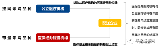评审或议价工作在报价不高于现行全国最低采购价的前提下进行,决定是否中选的决定性因素还是价格。 在留置针和输液器的综合评分环节,产品价格项为40分,占比最高。具体为:同一招标单元在所有的有效报价中,以最低投标报价为基准价,其价格分为满分;其他投标人的投标报价得分=(评标基准价/投标报价) X价格权值(40%)X100 (四舍五入后保留小数点后两位)。显而易见,低价是占有绝对优势的,其次考量的是产品质量可靠性、产品认证、生产工艺等指标(综合评分具体标准见文末附表)。 委托配送的名额限制为每个中选品种2-3家。配送过程必须严格遵守“两票制”的规定,为基层医疗机构、边远地区医疗机构配送时,允许多开一票。青海本就要求一般医用耗材实行两票制,这次高值耗材也明确纳入了执行范围。 虽然去年年底国家医保局声称“关于高值耗材‘两票制’问题有待进一步研究“,引发业内关于高耗“两票制”暂不会全国全面执行的判断,但地方上还是逐渐推开了。 青海要求按月对医用耗材费用进行结算,但挂网产品和带量采购产品的支付方不同:带量采购中选品种费用由医保部门直接与企业结算,挂网品种仍由医院结算,年度清算时从医保费用中扣除。医保基金直付机制正在全国多省市的带量采购工作中蔓延开来。 图:不同采购方式产生不同的结算费用支付方