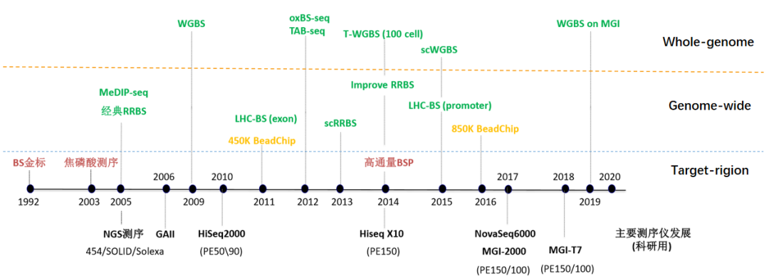DNA 甲基化是表观遗传学(Epigenetics)的重要组成部分,在维持正常细胞功能、遗传印记、胚胎发育以及人类肿瘤发生中起着重要作用,是目前新的研究热点之一。  DNA甲基化是最早被发现、也是研究最深入的表观遗传调控机制之一。广义上的DNA甲基化是指DNA序列上特定的碱基在DNA甲基转移酶(DNA methyltransferase,DNMT)的催化作用下,以s-腺苷甲硫氨酸(S-adenosyl methionine,SAM)作为甲基供体,通过共价键结合的方式获得一个甲基基团的化学修饰过程。这种DNA甲基化修饰可以发生在胞嘧啶的C-5位、腺嘌呤的N-6位及鸟嘌呤的N-7位等位点。一般研究中所涉及的DNA甲基化主要是指发生在CpG二核苷酸中胞嘧啶上第5位碳原子的甲基化过程,其产物称为5-甲基胞嘧啶(5-mC),是植物、动物等真核生物DNA甲基化的主要形式,也是发现的哺乳动物DNA甲基化的唯一形式。DNA甲基化作为一种相对稳定的修饰状态,在DNA甲基转移酶的作用下,可随DNA的复制过程遗传给新生的子代DNA,是一种重要的表观遗传机制。脊椎动物基因的甲基化状态有三种:持续的低甲基化状态,如管家基因;去甲基化状态,如发育阶段中的一些基因;高度甲基化状态,如女性的一条失活的X染色体。随着高通量测序技术(NGS)技术的发展,使我们能够从全基因组水平来分析5’甲基胞嘧啶及组蛋白修饰等事件,由此能够发现很多传统的基因组学研究所不能发现的东西。5mC是表观遗传最重要的一种修饰,广泛存在于植物、动物等真核生物基因组中, 称誉为“第五碱基”;5hmC是新发现的一种的修饰碱基,称为哺乳动物的“第六碱基”; 从1992年BS作为甲基化的金标准定下来之后,在二代测序未出现之前主要是对于位点检测的焦磷酸测序。2005年二代测序出现后,基于抗体富集方法的MeDIP-seq和经典RRBS出现了,到2009年全基因组甲基化出现,但是当时的测序运用并不是很成熟,大多是基于MeDIP做的。2010年HiSeq 2000出现才开始BS金标准的方法去尝试WGBS、RRBS的改进,然而也没有解决甲基化技术和成本的问题,直到HiSeq X10出现,降低了测序成本,国内才开始推出WGBS。目前主流的是RRBS、WGBS和Illumina的850K芯片。 基于金标准技术优势;国内外服务商及测序生态系统(Illumina和BGI);SCI文章、甲基化数据积累趋势和认可度。二代测序平台的亚硫酸盐测序(Bisulfite Sequencing)是DNA甲基化检测的技术发展趋势。 Zymo Research是表观遗传技术重要提供商,出现在80%以上甲基化金标准研究文章中,官网提供了3种DNA甲基化检测方案,如下: |
