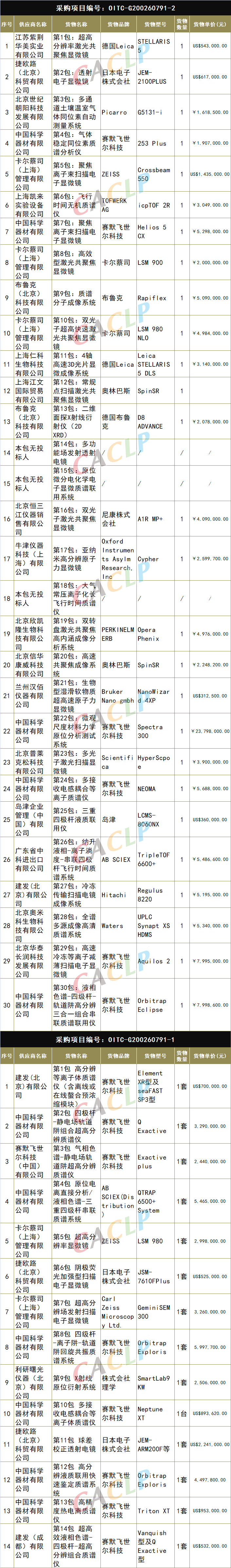 41套设备中标,品牌包括:赛默飞世尔、岛津、AB SCIEX、沃特世、布鲁克、Leica、日本电子株式会社、Hitachi、卡尔蔡司、奥林巴斯、尼康株式会社、ZEISS等。