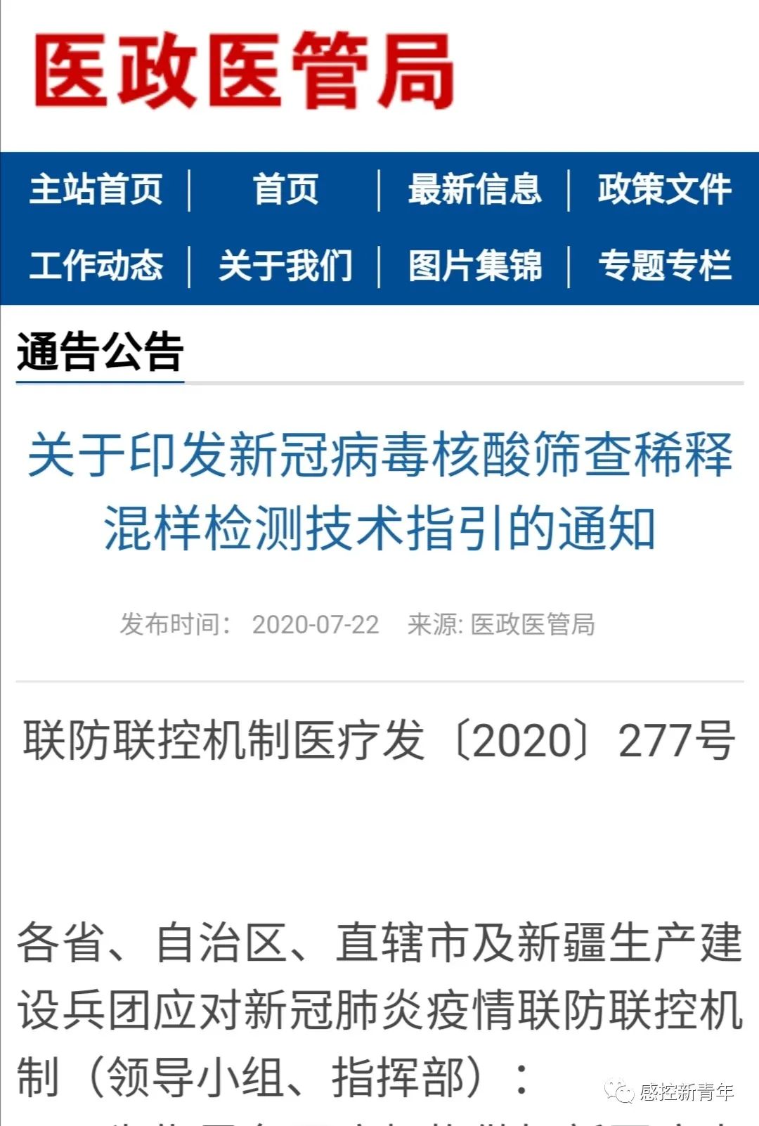 关于印发新冠病毒核酸筛查稀释混样检测技术指引的通知 发布时间: 2020-07-22 来源: 医政医管局 联防联控机制医疗发〔2020〕277号