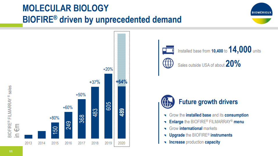 图片来源:梅里埃官网 在今年上半年,其临床应用销售额增长了19%,达到12.6亿欧元,而2019年上半年为10.6亿欧元。该公司的工业应用销售额为2.188亿欧元,较2.183亿欧元略有增长。 在临床应用中,生物梅里埃分子生物学产品的销售额在上半年达到了5.573亿欧元,比2019年上半年的3.263亿欧元增长了69%。微生物产品的销售额为4.604亿欧元,去年同期为4.845亿欧元。在2019年上半年,下降了4%。免疫分析的销售额从2019年上半年的2.292亿欧元下降14%,至1.95亿欧元。其他产品系列的销售额从2019年上半年的1,670万欧元急剧上升至2020年上半年的4,470万欧元。 梅里埃在一份声明中表示,该公司Biofire Filmarray产品线在第二季度有“明显增长”。并补充道,到6月底,Biofire仪器的安装基数增加到14,000台,而2019年底为10,400台。 图片来源:梅里埃官网 梅里埃指出,其微生物学业务受到“所有产品线试剂销售量下降的影响,这归因于医院就诊人数的下降,而该季度设备销售额急剧上升。” 按地区划分,第二季度梅里埃在美洲的销售额同比增长28%,从2.857亿欧元增长至3.647亿欧元,这是由FilmArray销售额推动的。欧洲,中东和非洲同比下降3%,而亚太地区的销售额下降6%。 梅里埃的净收入在2020年上半年跃升至1.73亿欧元,即每股1.46欧元,去年同期为1.41亿欧元,即每股1.19欧元。 图片来源:梅里埃官网 2020年上半年的研发费用从2019年上半年的1.79亿欧元跃升至2.03亿欧元,而2020年上半年的SG&A支出为3.82亿欧元。 梅里埃表示,由于新冠病毒大流行带来的不确定性,因此不会发布新的年度指导,但“基于上半年强劲的业绩和业务增长,预计第二季度财务业绩将非常可观。” 本文为翻译稿件,原文来源: https://www.genomeweb.com/business-news/biom-rieux-posts-16-percent-sales-growth-first-half-2020#.X1Xf_jMTDuw |