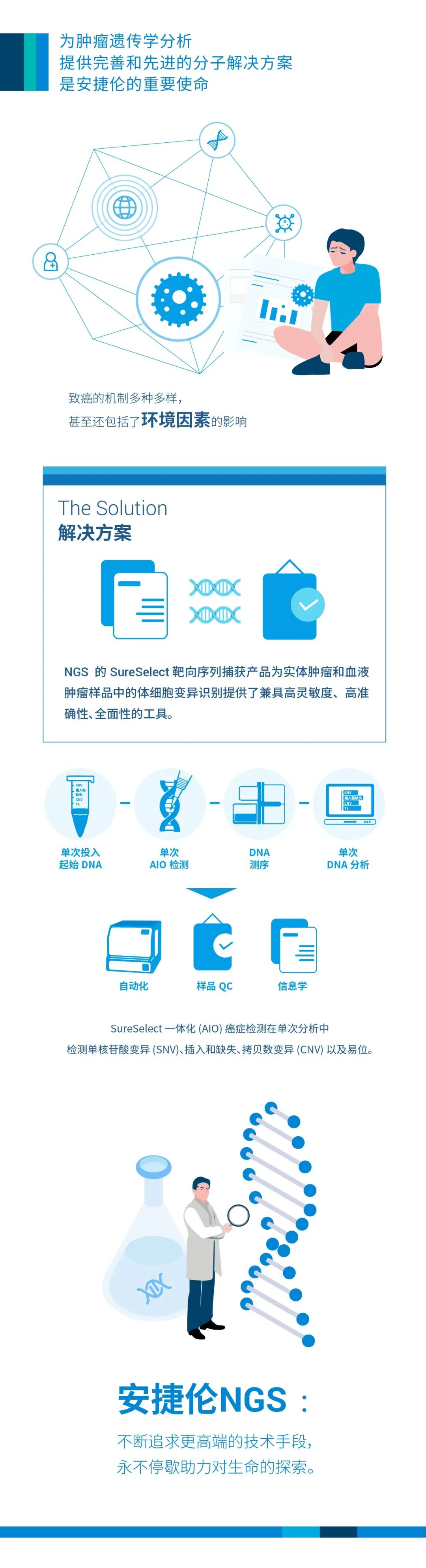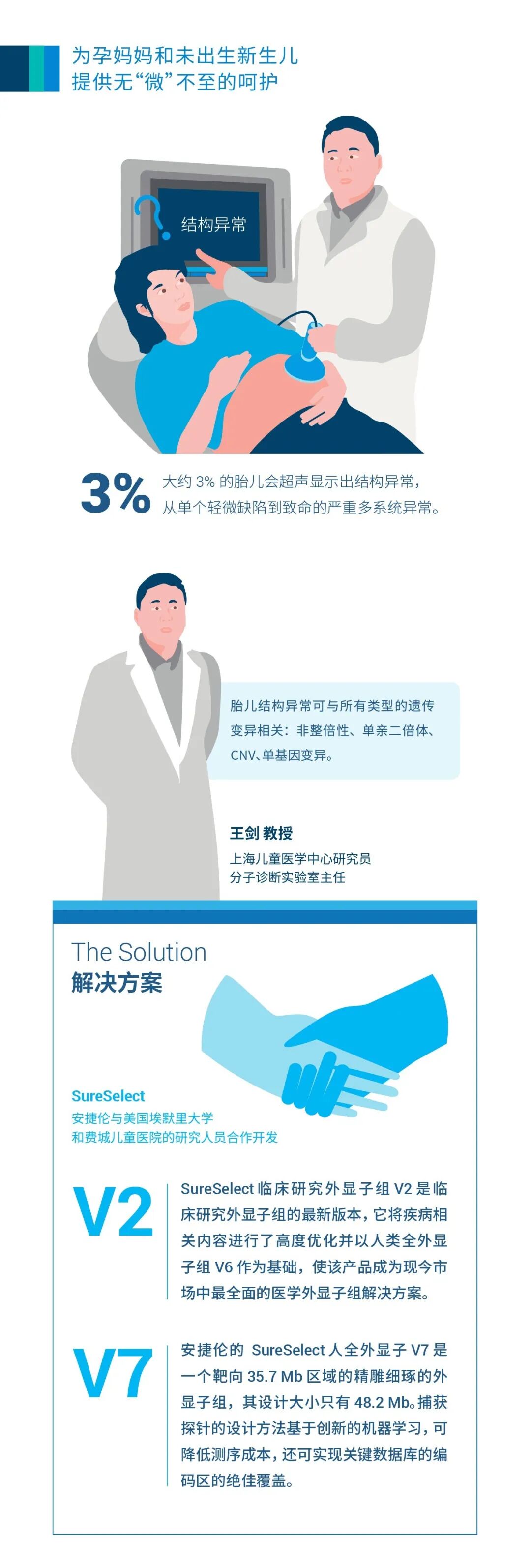 每年的9月12日是中国预防出生缺陷日。2005年,中国政府决定将9月12日定为 “中国预防出生缺陷日” 。作为世界上出生缺陷婴儿的高发国家之一,根据相关调研发现,我国出生缺陷的发生率约为 5.6%,每年的出生缺陷儿数量高达80万-120万人,大约每30秒钟就会诞生一个缺陷儿,出生缺陷防治工作面临严峻挑战。 出生缺陷的遗传因素 出生缺陷可由染色体畸变、基因突变等遗传因素引起,是导至围产儿、新生儿及婴幼儿死亡的主要原因,也可导至儿童结构畸形、智力发育障碍、语言发育障碍等严重残疾,给家庭带来严重的精神及经济负担。染色体畸变可分为染色体数目异常和结构异常:数目异常如三体综合症,又称唐氏综合症;结构异常包括染色体缺失、移位、倒位等,如猫叫综合症。基因突变分为单基因病和多基因病:单基因病遵循孟德尔遗传规律,常见的苯丙酮尿症即是常染色体上的某一基因出现突变导至疾病发生;多基因病则是由遗传和环境等多种因素共同决定的,如唇腭裂等。 出生缺陷的基因筛查 当前临床上用于涉及遗传层面的产前检测技术包括荧光原位杂交(FISH)、染色体核型分析、染色体微阵列分析及基因测序等,其中FISH和核型分析是传统的分子生物学分析方法,因操作繁琐、性能不足等原因发展受到限制,已经逐步被染色体微阵列和测序所取代。 染色体微阵列分析相比传统的FISH和核型分析有更高的分辨率,这种高分辨率的检测技术可以对遗传物质发生的小片段插入或缺失进行评估,为部分出生缺陷如不明原因智力低下、发育迟缓、自闭症和多发畸形等寻找病因。染色体微阵列芯片可以分为比较基因组杂交芯片 、BAC(细菌人工染色体)芯片以及基于SNP的芯片。比较基因组杂交芯片以安捷伦的aCGH芯片为代表,是一种测定两个 DNA 样品(一个样品一个对照)之间拷贝数变化的技术。拷贝数信息可形象化地反映或大或小的染色体畸变,包括微缺失和微重复等极小的 DNA 片段。采用 60 mer长的探针,具有更高的特异性,相比采用短探针的SNP芯片,对同一区域的检测只需使用极少探针即可获得精确的结果。BAC芯片同为比较基因组杂交芯片,其探针是150-200 kb的基因组DNA,不过受制于细菌人工染色体文库,其分辨率、均一性受到影响,目前基本已被其它种类芯片替代。SNP 芯片检测时疾病样本单独杂交在一块芯片上,再与数据库里的参照样本进行比较,是单色芯片;同时探针设计受SNP位点分布的局限,一些区域无法设计探针或探针无法均一分布。 随着基因测序技术的快速发展和广泛应用,二代测序技术已成为遗传性疾病临床辅助诊断必不可少的利器。得益于新生儿疾病筛查的病种绝大多数为病因明确、研究深入的单基因遗传病,二代测序技术在新筛疑似阳性病例的后续确诊工作中有得天独厚的优势。特别是全外显子组测序(WES),是目前全球公认最适合遗传性疾病检测的测序方法。外显子是人基因组上编码蛋白的区域,利用序列捕获技术可以捕获并且富集全部的外显子,之后进行二代测序。这种大规模并行式分析凭借能够分析约含 20,000 个基因的外显子基因组的高性价比单反应方法,已经在加速疾病基因发现中发挥了重要作用。在临床研究环境下,特别在研究罕见疾病时,对这类靶标的同步分析有助于从人外显子组中发现的 20,000 到50,000 个变异体中检测出疾病相关变异体。随着为提高变异体检测的可靠性而设定的靶标覆盖率标准日益增高,如今的挑战在于提供能够实现完全靶标覆盖的全面设计。 安捷伦Sureselect捕获探针可覆盖最全面的内容,适用于任何应用的外显子组解决方案。其测序结果包含了难捕获区域的相关数据库的更新内容,可实现蛋白质编码区域的全面分析。