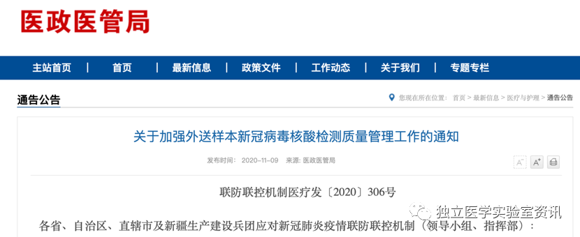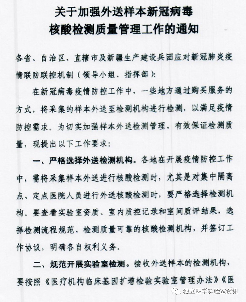 为切实加强样本外送检测管理,有效保证检测质量,也提出了六点具体的工作要求,其中每月一次的室间质评,不合格的机构将不得开展新冠病毒核酸检测,第三方医检机构在开展核酸业务时,请关注,以下是通知原文: