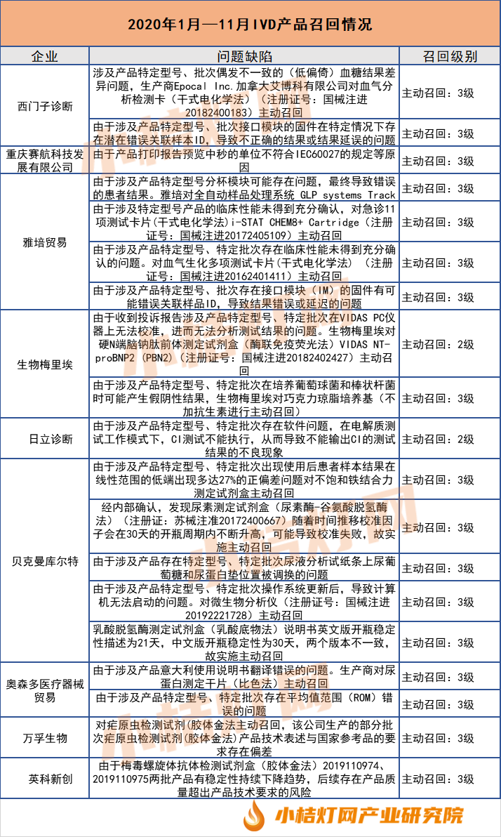 事实上,根据统计,2018年以来体外诊断行业的召回事件就频繁出现。就企业来说除贝克曼、雅培、西门子诊断、奥森多、梅里埃这些外资巨头外,万孚生物、英科新创等等本土企业也名列其中。