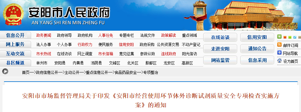 近日,安阳市市场监督管理局发布一则《安阳市经营使用环节体外诊断试剂质量安全专项检查实施方案》的通知,以下简称《通知》。《通知》表示对体外诊断的试剂生产、经营、使用全环节将进行严格的审查工作。
