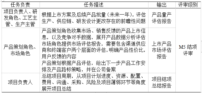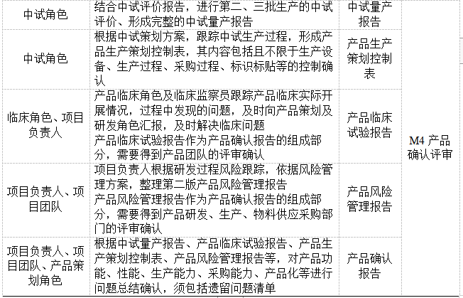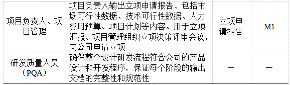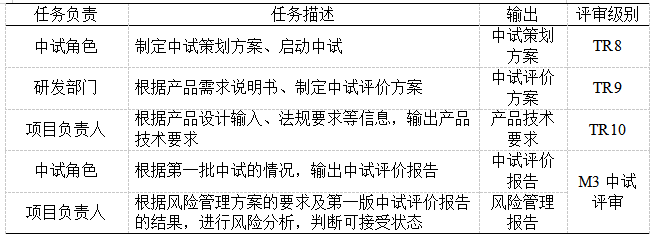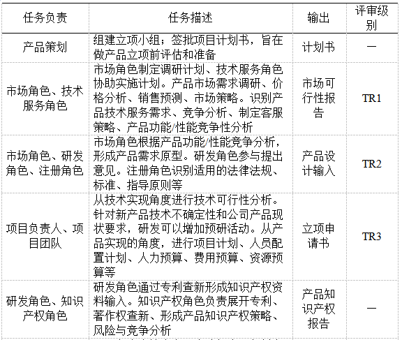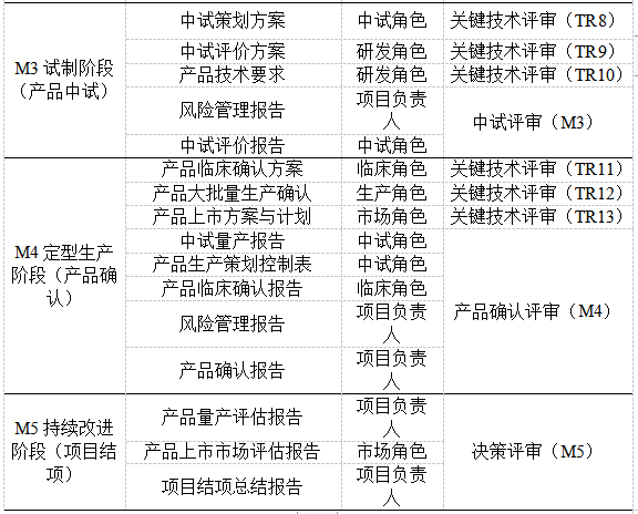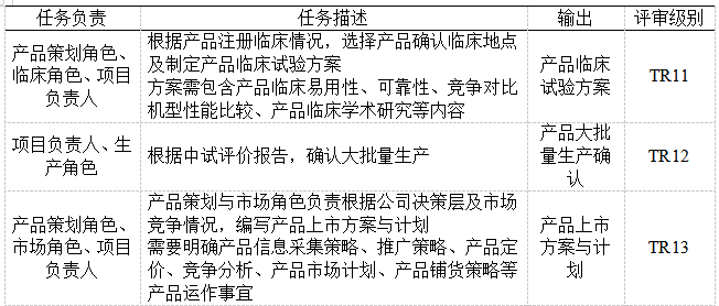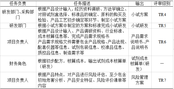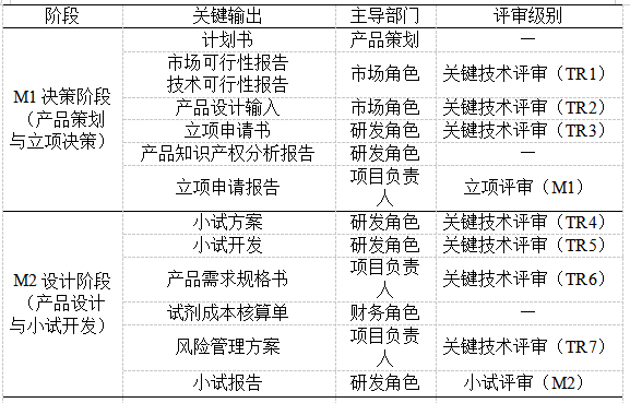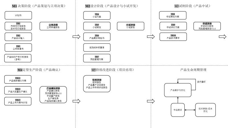 1. 设计开发各阶段简述 不同的市场环境下不同企业的产品多样化特征较为明显,但产品设计开发过程中存在许多内在的相似性。体外诊断产品设计开发的基本程序一般包括五个阶段。 * 决策阶段 对市场环境需求、科学技术发展、企业生产能力、产品的经济效益等进行可行性调研分析,并通过对产品进行先行试验或者专家评审后,再做出产品是否设计开发的决策。 * 设计阶段 通过对产品结构、材料、工艺的分析选择,设计、计算及进行必要的试验完成编(绘)制全部产品图样和设计文件。 * 试制阶段 文档、工艺文档等进行正确性验证,并对产品的环境适应性、技术可靠性进行检验。 * 持续改进阶段 通过了解并掌握加工、装配、储运及使用中的质量信息、用户要求、及时汇总、分析与处理,进行必要的试验和产品改进,以实现产品质量的不断发展,提高产品的实用性。 产品研发关键节点流程参见下图。 图 1 产品研发关键节点流程 注:M1~M5,里程碑决策评审,同时表示相应的阶段;TR1~TR13,关键技术或业务评审。 各阶段详细划分举例参见下表。 表 1 各阶段详细划分举例 2. 各阶段关键输出与评审案例 各阶段关键输出与评审举例参见下表。 表 2 各阶段关键输出与评审举例 3. 各阶段任务举例 3.1 M1决策阶段(产品策划与立项决策阶段)举例 M1决策阶段(产品策划与立项决策阶段)的主体任务与角色定义参见下表。 表 3 M1决策阶段主体任务与角色定义 3.2 M2设计阶段(产品设计与小试开发阶段) M2设计阶段(产品设计与小试开发阶段)的主体任务与角色定义,参见下表。 表 4 M2设计阶段主体任务与角色定义 3.3 M3试制阶段(产品中试阶段)举例 M3试制阶段(产品中试阶段)的主体任务与角色定义,参见下表。 表 5 M3试制阶段主体任务与角色定义 3.4 M4定型生产阶段(产品确认阶段) M4定型生产阶段(产品确认阶段)的主体任务与角色定义,参见下表。 表 6 M4定型生产阶段主体任务与角色定义 刘博 一般情况下,企业在研发阶段选择临床样品对产品性能进行验证。 3.5 M5持续改进阶段(项目结项阶段) M5持续改进阶段(项目结项阶段)的主体任务与角色定义,参见下表。 刘博 以上M1到M5阶段,各阶段应输出相应的产品报告,但实际产品设计开发过程中并不仅限于以上报告。 4. 产品生命周期管理 产品生命周期管理阶段的主体任务与角色定义,参见下表。 |