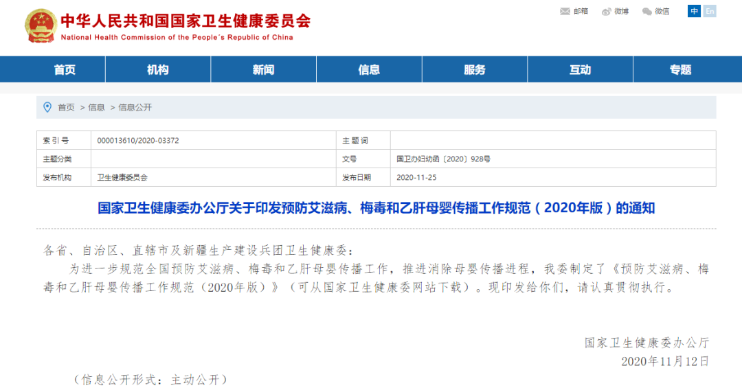 消除母婴传播 刚刚,国家卫健委发布了关于印发预防艾滋病、梅毒和乙肝母婴传播工作规范(2020年版)的通知,《通知》内容表示此次制定本规范,是为贯彻落实《“健康中国2030”规划纲要》,进一步规范全国预防艾滋病、梅毒和乙肝母婴传播(以下简称预防母婴传播)工作,推进消除母婴传播进程,促进妇女儿童健康。 工作目标 (一)总目标 全面、规范落实预防母婴传播综合干预服务,减少相关疾病母婴传播,不断提高妇女儿童健康水平和生活质量。 (二)具体目标 至2025年底,实现以下目标: 1.孕产妇艾滋病、梅毒和乙肝检测率达95%以上,孕期检测率达90%以上,孕早期检测率达70%以上。 2.艾滋病感染孕产妇抗艾滋病病毒用药率达95%以上,所生儿童抗艾滋病病毒用药率达95%以上。 3.梅毒感染孕产妇梅毒治疗率达95%以上,所生儿童预防性治疗率达95%以上。 4.乙肝感染孕产妇所生儿童首剂乙肝疫苗及时接种率达95%以上,乙肝免疫球蛋白及时注射率达95%以上。 5.艾滋病母婴传播率下降至3%以下。 6.先天梅毒报告发病率下降至15/10万活产以下。 7.乙肝病毒表面抗原阳性孕产妇所生儿童12月龄内乙肝表面抗原检测阳性率下降至1%以下。 上述指标定义与计算方法见附件1。(后台回复【附件】获取全部内容) 工作内容 预防母婴传播以艾滋病、梅毒和乙肝综合防治体系为支撑,以常规妇女保健、孕产妇保健和儿童保健工作为基础,为育龄人群、孕产妇及所生儿童提供相关服务。