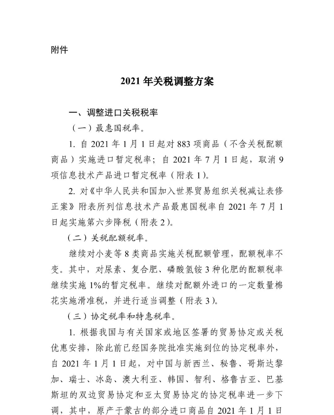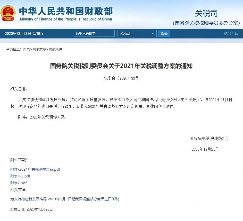 摘要: 为支持加快构建新发展格局,推动经济高质量发展,根据《中华人民共和国进出口关税条例》的相关规定,12月23日,国务院关税税则委员会办公室发布了《国务院关税税则委员会关于2021年关税调整方案的通知》。该通知规定 ...