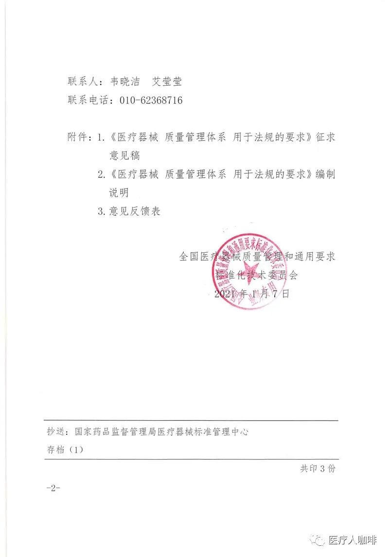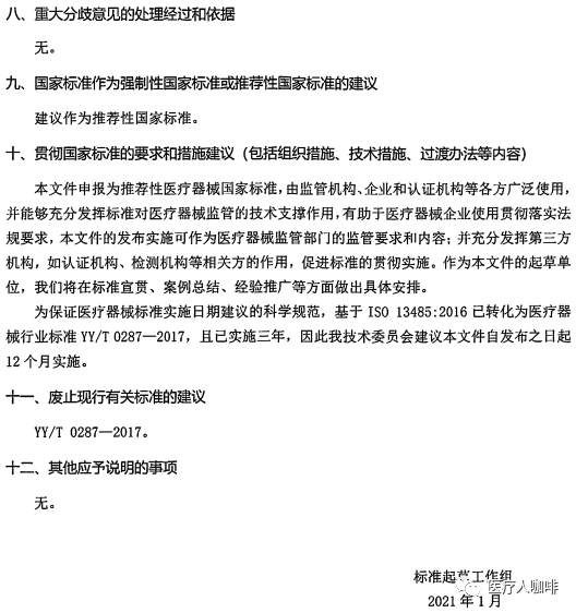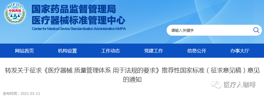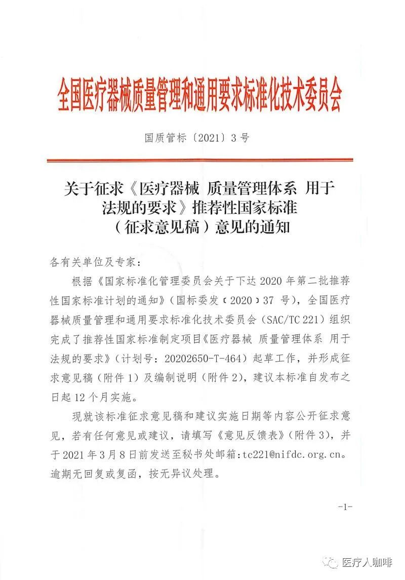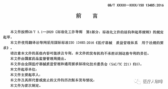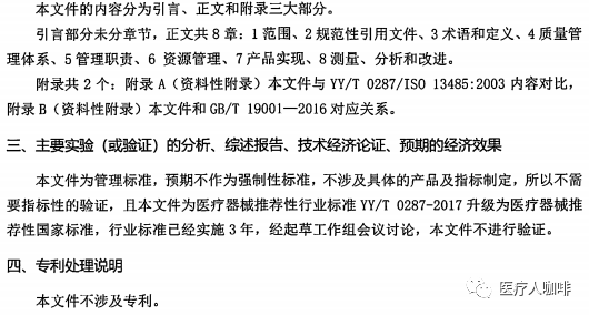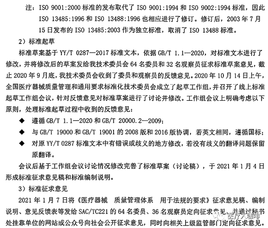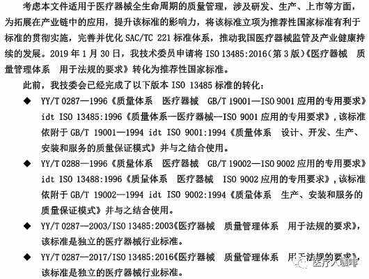 近日,国家药监局医疗器械标管中心官方发布征求《医疗器械 质量管理体系 用于法规的要求》推荐性国家标准(征求意见稿)意见的通知。为推动医疗器械监管及产业健康持续发展,申请将ISO13485:2016转化为推荐性国家标准。由此,YY/T0287:2017也将改为GB/T。详情如下: