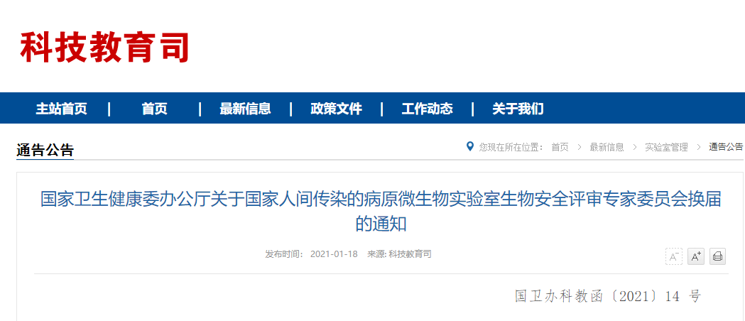为适应病原微生物实验室生物安全工作形势,切实发挥专家在实验室生物安全监管和行政审批中的技术支撑作用,按照《生物安全法》《病原微生物实验室生物安全管理条例》等有关规定,在有关部门和单位推荐的基础上,经过培训、考核等程序,国家卫健委组织对国家人间传染的病原微生物实验室生物安全评审专家委员会进行了换届。