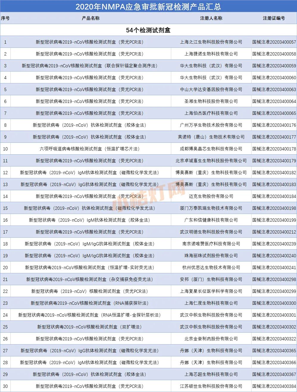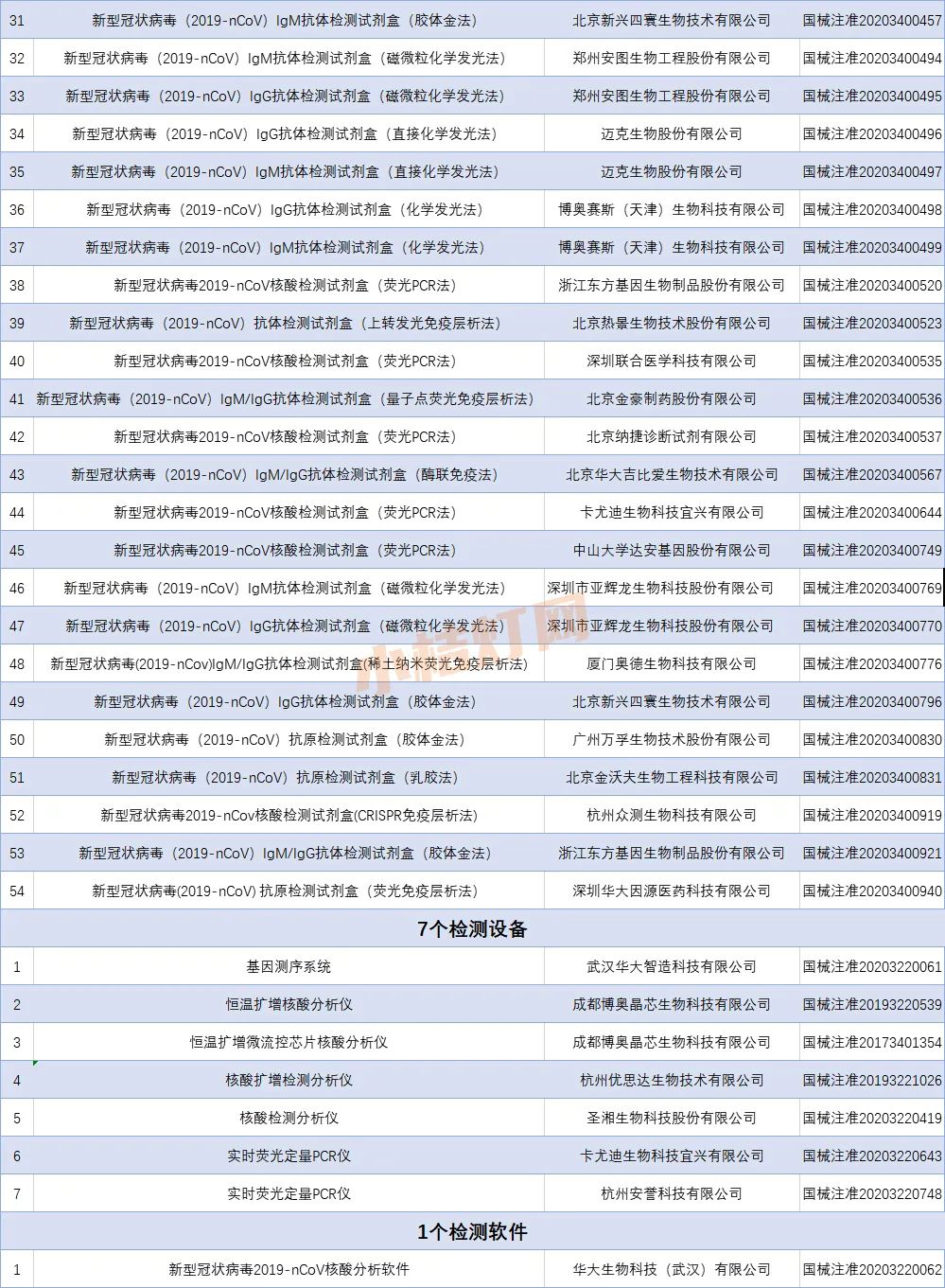 2020年,NMPA已完成54个新型冠状病毒检测试剂盒、5个仪器设备、1个软件的应急审评工作,上述60个产品经国家药监局审批获准上市。