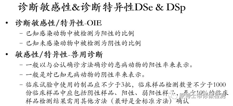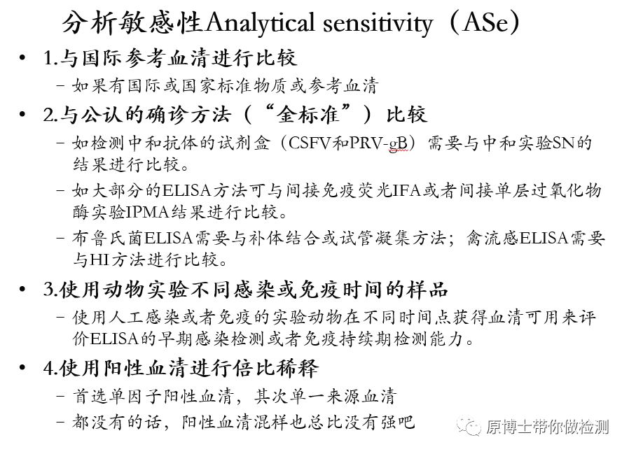 血清学方法看似简单实则种类繁多,比如病毒中和实验virus neutralisation test (VNT), enzyme-linked immunosorbent assay (ELISA), 血凝抑制实验haemagglutination inhibition (HI) ,补体结合实验 complement fixation test (CFT),琼扩实验 agar gel immunodiffusion (AGID), 间接免疫荧光实验 indirect fluorescent antibody test (IFAT)等等。 本章内容主要参照OIE《Manual of Diagnostic Tests and Vaccines for Terrestrial Animals 2019》(以下简称“OIE”);《兽用诊断制品试验研究技术指导原则》(以下简称“兽用诊断”)和《2019新型冠状病毒抗原/抗体检测试剂注册技术审评要点》(以下简称“医学诊断”)。 今天以使用最多的ELISA实验为例,由于相关的概念前面都介绍过了,这章直奔主题了。 1.重复性 Repeatability,也称为精密度Precision 小结:笔者认为针对ELISA试剂盒批内重复性评价,至少包含阴性,弱阳和中阳3个浓度的样品,每份样品至少重复3-5次,由不同人员,在不同时间进行实验.ELISA实验的变异系数建议使用OD值,由于低浓度样品OD值的变异系数会比较大,因此要求CV≤15%。 2.再现性Reproducibility 与核酸是一样的。 3.分析敏感性Analytical sensitivity(ASe),也称最低检测限 limit of detection (LOD)或者灵敏度。 小结:血清学方法的线性范围通常不如核酸检测宽,所以通常使用2倍稀释,OIE提到核酸检测的20次重复95%阳性与本章的10次重复100%阳性其实是一个意思。需要强调的一点是:稀释样品时大家一定要使用同种阴性血清稀释血清样品,不要用试剂盒的样品稀释液来稀释样品。 相对于核酸检测,我只要将样品浓度定值到绝对病毒拷贝数,就可以对所有的核酸检测方法进行评价。对于血清学方法来说,这个绝对值是不存在的,因此以上的评价方式只是一个指导原则,具体操作有几种方式: 4.分析特异性Analytical specificity(ASp),也称交叉反应Cross-reactivity 小结:特异性检测除了需要检测可能存在交叉反应的其他病原阳性血清外,还应对内源性干扰物(甘油三酯、血红素、肝素等),血清中可能存在的药物在血液中的代谢产物以及其他病原体进行检测。 5.诊断敏感性Diagnosticsensitivity(DSe) 6.诊断特异性Diagnosticspecificity(DSp) 小结:血清学的评价看似比核酸方法评价更简单,实际上由于不同的用途,使评价的结果更复杂。 |