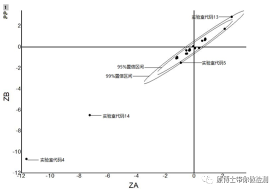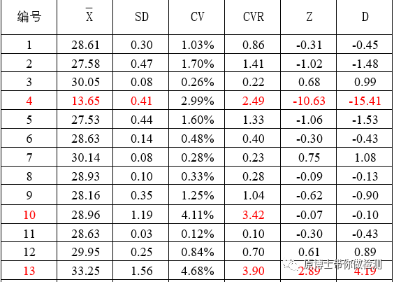(4)每个浓度各家实验室的统计分析 计算每家实验室`X、SD、CV、CVR、Z、D 实验室4、10、13 CVR大于2,结果不满意,需要采取行动,提示检测精密度存在问题。 实验室13 Z大于2小于3,需要警惕;实验室4 | Z |大于3,结果不满意,需要采取行动,提示检测准确度存在问题。 (5)评估每个实验室在该项目的整体水平 Youden plot显示实验室13 超出95%置信区间,需要警惕;实验室4和14超出99%置信区间,结果不满意,需采取行动。 4.纠正措施 能力验证的目的是发现不足,及时采取纠正措施,进而提高实验室的能力。所以能力验证完成后,如果出现警戒或不满意结果,需要从“人机料法环”各个环节开展实验室内部的质量控制,及时发现问题,解决问题。 |
