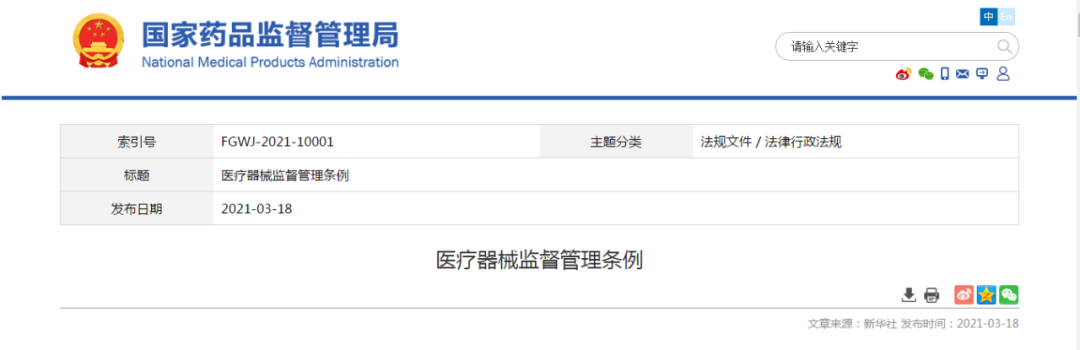 (2000年1月4日中华人民共和国国务院令第276号公布 2014年2月12日国务院第39次常务会议修订通过 第一章 总则 第一条 为了保证医疗器械的安全、有效,保障人体健康和生命安全,促进医疗器械产业发展,制定本条例。 第二条 在中华人民共和国境内从事医疗器械的研制、生产、经营、使用活动及其监督管理,适用本条例。 第三条 国务院药品监督管理部门负责全国医疗器械监督管理工作。 国务院有关部门在各自的职责范围内负责与医疗器械有关的监督管理工作。 第四条 县级以上地方人民政府应当加强对本行政区域的医疗器械监督管理工作的领导,组织协调本行政区域内的医疗器械监督管理工作以及突发事件应对工作,加强医疗器械监督管理能力建设,为医疗器械安全工作提供保障。 县级以上地方人民政府负责药品监督管理的部门负责本行政区域的医疗器械监督管理工作。县级以上地方人民政府有关部门在各自的职责范围内负责与医疗器械有关的监督管理工作。 第五条 医疗器械监督管理遵循风险管理、全程管控、科学监管、社会共治的原则。 第六条 国家对医疗器械按照风险程度实行分类管理。 第一类是风险程度低,实行常规管理可以保证其安全、有效的医疗器械。 第二类是具有中度风险,需要严格控制管理以保证其安全、有效的医疗器械。 第三类是具有较高风险,需要采取特别措施严格控制管理以保证其安全、有效的医疗器械。 评价医疗器械风险程度,应当考虑医疗器械的预期目的、结构特征、使用方法等因素。 国务院药品监督管理部门负责制定医疗器械的分类规则和分类目录,并根据医疗器械生产、经营、使用情况,及时对医疗器械的风险变化进行分析、评价,对分类规则和分类目录进行调整。制定、调整分类规则和分类目录,应当充分听取医疗器械注册人、备案人、生产经营企业以及使用单位、行业组织的意见,并参考国际医疗器械分类实践。医疗器械分类规则和分类目录应当向社会公布。 第七条 医疗器械产品应当符合医疗器械强制性国家标准;尚无强制性国家标准的,应当符合医疗器械强制性行业标准。 第八条 国家制定医疗器械产业规划和政策,将医疗器械创新纳入发展重点,对创新医疗器械予以优先审评审批,支持创新医疗器械临床推广和使用,推动医疗器械产业高质量发展。国务院药品监督管理部门应当配合国务院有关部门,贯彻实施国家医疗器械产业规划和引导政策。 第九条 国家完善医疗器械创新体系,支持医疗器械的基础研究和应用研究,促进医疗器械新技术的推广和应用,在科技立项、融资、信贷、招标采购、医疗保险等方面予以支持。支持企业设立或者联合组建研制机构,鼓励企业与高等学校、科研院所、医疗机构等合作开展医疗器械的研究与创新,加强医疗器械知识产权保护,提高医疗器械自主创新能力。 第十条 国家加强医疗器械监督管理信息化建设,提高在线政务服务水平,为医疗器械行政许可、备案等提供便利。 第十一条 医疗器械行业组织应当加强行业自律,推进诚信体系建设,督促企业依法开展生产经营活动,引导企业诚实守信。 第十二条 对在医疗器械的研究与创新方面做出突出贡献的单位和个人,按照国家有关规定给予表彰奖励。 第二章 医疗器械产品注册与备案 第十三条 第一类医疗器械实行产品备案管理,第二类、第三类医疗器械实行产品注册管理。 医疗器械注册人、备案人应当加强医疗器械全生命周期质量管理,对研制、生产、经营、使用全过程中医疗器械的安全性、有效性依法承担责任。 第十四条 第一类医疗器械产品备案和申请第二类、第三类医疗器械产品注册,应当提交下列资料: (一)产品风险分析资料; (二)产品技术要求; (三)产品检验报告; (四)临床评价资料; (五)产品说明书以及标签样稿; (六)与产品研制、生产有关的质量管理体系文件; (七)证明产品安全、有效所需的其他资料。 产品检验报告应当符合国务院药品监督管理部门的要求,可以是医疗器械注册申请人、备案人的自检报告,也可以是委托有资质的医疗器械检验机构出具的检验报告。 符合本条例第二十四条规定的免于进行临床评价情形的,可以免于提交临床评价资料。 医疗器械注册申请人、备案人应当确保提交的资料合法、真实、准确、完整和可追溯。 第十五条 第一类医疗器械产品备案,由备案人向所在地设区的市级人民政府负责药品监督管理的部门提交备案资料。 向我国境内出口第一类医疗器械的境外备案人,由其指定的我国境内企业法人向国务院药品监督管理部门提交备案资料和备案人所在国(地区)主管部门准许该医疗器械上市销售的证明文件。未在境外上市的创新医疗器械,可以不提交备案人所在国(地区)主管部门准许该医疗器械上市销售的证明文件。 备案人向负责药品监督管理的部门提交符合本条例规定的备案资料后即完成备案。负责药品监督管理的部门应当自收到备案资料之日起5个工作日内,通过国务院药品监督管理部门在线政务服务平台向社会公布备案有关信息。 备案资料载明的事项发生变化的,应当向原备案部门变更备案。 第十六条 申请第二类医疗器械产品注册,注册申请人应当向所在地省、自治区、直辖市人民政府药品监督管理部门提交注册申请资料。申请第三类医疗器械产品注册,