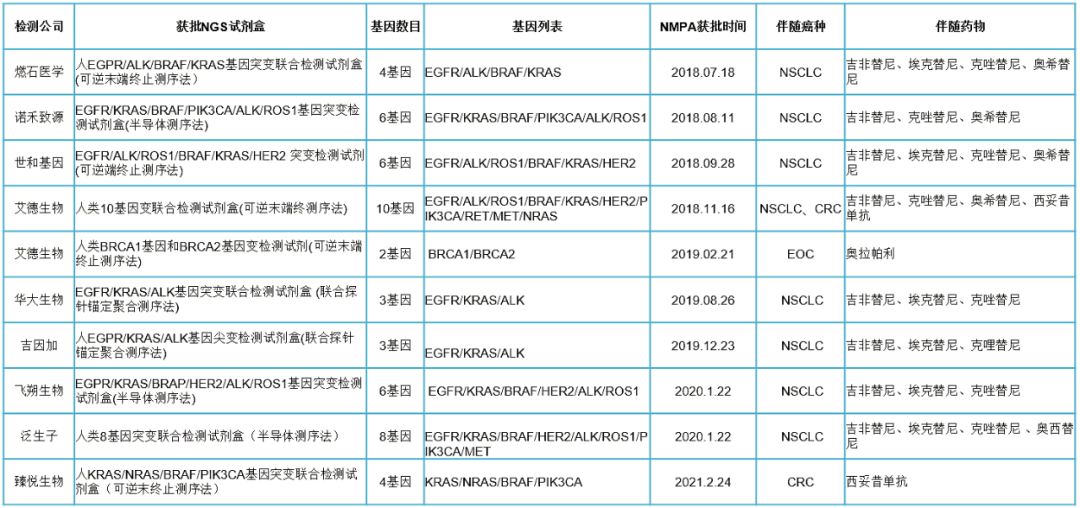 截止2021年4月6日, NMPA批准了10款NGS CDx-IVD产品(均为小panel),1款专门用于肠癌(臻悦生物)、1款同时用于肠癌和非小细胞肺癌(艾德生物)、1款用于卵巢癌(艾德生物),其他7款均用于非小细胞肺癌(见下表)。尚无NGS大panel和液体活检产品获批。