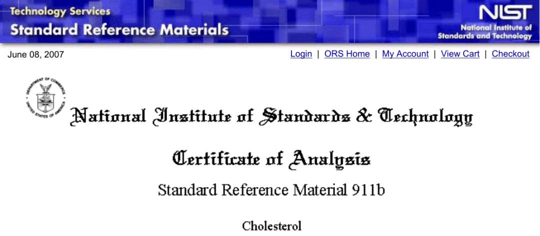 这个一级参考物质的定义,指出了分析物是高纯度的物质,证实了物质中分析物的质量/摩尔分数,它的成分实现了关注的分析物的国际单位制。请注意,这个参考物质中分析物在整个该材料中的质量/摩尔分数。特别请注意的是,在注释1中,特别说出了:一级参考物质(RM)具有它的设定值,或是直接被一级RMP设定、或间接地以相应分析方法确定材料中的不纯物(如,质量平衡方法 mass balance method)。 特别是:一级参考物质的设定值以间接地以相应分析方法确定材料中的不纯物。究竟一个目前国际上公认的一级参考物质是如何介绍和叙述的? 为了说明怎样的参考物质是一级参考物质。 我以美国国家标准和技术研究院(NIST)发布的标准参考物质(SRM)911b的胆固醇证书为例。