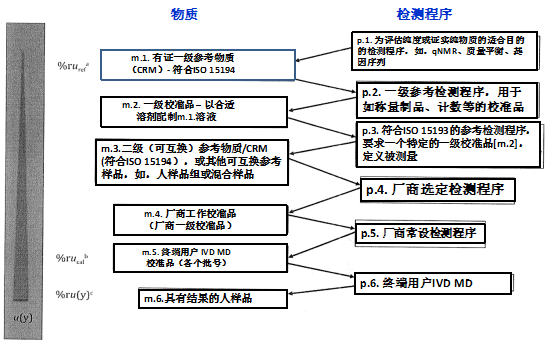 然后,厂商以工作组校准品为准,对厂商的常设检测程序(MP)进行校准,对厂商的终端用户校准品进行定值。 这个终端用户校准品再与厂商的终端用户检测系统结合(即终端用户IVD MD),形成可以提供让临床实验室用于对临床样品进行糖化血红蛋白的检测。这样使临床样品的HbA1c的检测结果,在可靠性上,它的量值可以上溯到IFCC参考方法与参考物质,实现了溯源性。 ISO 第二版17511的第5.4.8、5.4.9、5.4.10节内容参见以下。 5.4.8 厂商常设MP 厂商常设MP(见图3,p.5)应确定被一个或多个厂商工作校准品校准的MP(见图3,m.4)或较高类型的校准品,并被确认了分析选择性。 5.4.9 终端用户IVD MD校准品 厂商终端用户IVD MD校准品(见图3,m.5)应按照厂商常设MP(见图3,p.5)设定了它的值,并被预期去校准终端用户IVD MD。终端用户IVD MD校准品(见图3,m.5)设定值的ucal,应由厂商(见4.7)估计,合并所有相应较高等级的不确定度,除了在校准等级中以后MP的每一个的不确定度外,下到和包括厂商常设MP 图3,[p.5]。 5.4.10 终端用户IVD MD 终端用户IVD MD(图3,p.6)应描述一个被一个或多个终端用户校准品校准的检测系统。这个MP,在确定的被测量校准等级中最后的MP,被用于检测人样品,和产生被测量的最后检测值,具有被终端用户估计的报告值的合并标准检测不确定度,考虑在确定的校准等级的每个较高步骤累积的所有已知的检测不确定度。