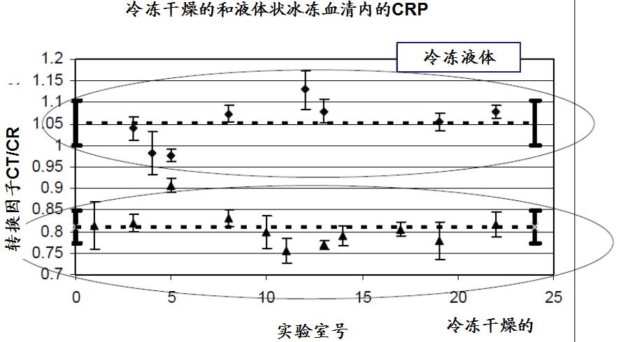 图1 天然CRP的五聚体 但是,2008年欧洲参考物质和参考检测程序研究院(IRMM),面临原先在1993年制备的CRM(后改为ERM-DA470)即将用完,为此,制备了一个新批号的血浆蛋白参考物质,去替代即将耗尽的ERM-DA470,确保血清蛋白检测标准化的连续性。该新物质,被称为ERM-DA470k/IFCC。该物质被确定了12个蛋白,但它不适合确认CRP,因发现经冷冻干燥过程后,造成常规的免疫检测的CRP丧失了约20%,这是与未经冷冻干燥、储存在液态深低温状态的物质比较得出的。决定使用相同方式制备的、但未经冷冻干燥处理、储存在深低温的液态状态的那批另一个物质,命名为ERM-DA472/IFCC,取代了冻干形式的ERM-DA470k/IFCC。ERM-DA472/IFCC确定的CRP(由免疫散射比浊、免疫透射比浊)使用了参考物质ERM-DA470作为校准物。当时也已经发现,若在ERM-DA470(原CRM 470)冷冻干燥前添加钙,可以缓解CRP回收率的下降。在复溶中使用钙离子也可改善CRP检测结果的回收率。但是,在最后的ERM-DA470k/IFCC中没有这么做,因为钙对稳定性和其他蛋白的互换性的影响尚未可知。 在当时的IRMM提供的资料上,可以看到:未经冷冻干燥的冷冻液体与冷冻干燥品,使用了多个CRP免疫检测方法在20多个实验室的检测结果,有着明显差异。如下图所示,图的上半部分为深低温液体保存的,图的下半部为冷冻干燥保存的;所有冷冻保存的结果,与冷冻干燥前的CRP结果几乎一致,回收率为接近105%;但是经冷冻干燥后复溶的液体中,检测结果的回收平均水平,为处理前的81%。
