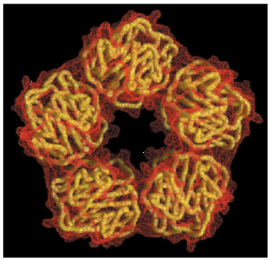 天然人血清中,具有生物活性的C-反应蛋白,是一个五个单体形成的五聚体。如下图所示。
