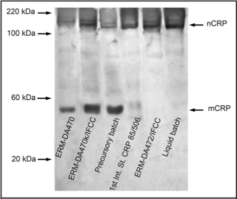 为此,IRMM做出决定,以深低温保存的液体状态参考物质,作为CRP检测的参考物质。 在临床化学杂志的2010年。题目为:不同制品包括2个批准的参考物质中C-反应蛋白的物理化学状态的分析中。Dr Ingrid Zegers与Dr Heinz Schimmel等参与ERM DA470研制的专家在发现CRP结果偏低后的实验报告,也非常说明问题。 专家们分析了一组含有CRP的4个冻干的和2个未冻干的血清材料。在冻干材料复溶后,CRP在每个材料中的浓度大约为40 mg/L。 半天然电泳与蛋白印迹结合揭示了,在所有6个分析的材料中,均有分子量约150 kDa的一个区带,相当于nCRP(见图3)。在一个表现为分子量约50 kDa的,为第二个区带的移动,被假设相当于单体CRP。但仅在被冻干的CRP材料的电泳谱中检出。在液体的和液体-深低温的材料中没有(接近没有)。