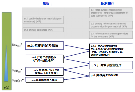 在既无国际认可的参考物质、也无估计认可的参考方法下,厂商具有的检测系统是依靠自己建立的内部指定确定的参考物质。没有一级校准品、没有参考检测程序、也没有协同一致的方案,不可溯源到SI。 近期,为了尽早检出有无微生物感染,世界上出现了一个降钙素原(procalcinogen)的检测系统,已经被大家广泛应用。这是一个非常典型的示例。 原则上,该公司的降钙素原建立的溯源性,应该就是这节内容叙述的情况。 5.7 被测量具有的计量溯源性仅到厂商内部指定确定的RM的情况 5.7.1 通用考虑 图6中描述的校准等级应用到具有计量溯源性的被测量,仅到厂商内部指定确定的RM(见图6,m.3),对某些被测量,没有确认的纯RM(见图6,m.1)、没有一级校准品(见图6,m.2)、没有RMP(见图6,p.3)、没有协同一致性方案、和没有溯源性到SI。在5.7.2至5.7.7中详尽地阐述了这些类型的校准等级的描述中要解决的特征。 图6—校准等级—由厂商内部指定确认RM定义的被测量 (没有一级RM或CRM、没有RMP;没有协调一致性方案;没有可溯源到SI)。 物质[m.1]和[m.2],和MP[p.1]、[p.2]、和[p.3]不可应用(N/A)。 5.7.2 RM的选择 由于较高等级RM和MP(见图6,m.1,m.2,p.1,p.2,p.3)没有出现在这些类型被测量中,若可用,应建立指定的RM(图6,m.3),作为在被测量确定的校准等级中计量上的最高水平。 注1:为协助确保这个类型特定终端用户IVD MD校准的一致性,厂商有时建立指定的MP(见图6,p.4)和/或指定RM(见图6,m.3),作为这些校准等级的最高水平。 注2:指定RM(见图6,m.3)有时是由例如纯化的生物标志物配制,然后被选定的MP检测(见图6,p.4)和进一步校准,和对工作校准品设定值(见图6,m.4)。这样的工作校准品通常制备在以人样品基质材料或其他合适的基质中,或者其他由例如人样品组或人样品混合样品、或“外加配制”的人样品组成。“spiked”human samples 5.7.3 厂商选定MP 在厂商使用选定MP建立了独特校准等级(见图6,p.4)情况下,没有为被测量有可用的RM(如,MP依据其他性质,如UV吸收;依据计数的程序;等),选定MP应为定义被测量的特定校准等级中是计量上的最高水平。 5.7.4 厂商常设MP 厂商的常设MP(见图6,p.5)应确定一个检测系统,以厂商工作校准品校准(见图6,m.4),会由指定RM组成,包括人样品组或混合样品。常设MP(见图6, p.5)应被用于确定厂商终端用户IVD MD校准品设定值(见图6,m.5)。