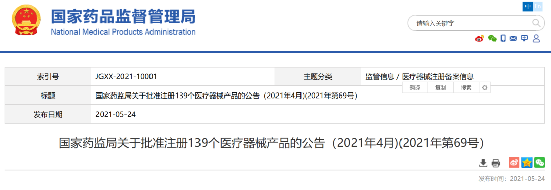 2021年5月24日,国家药品监督管理局发布关于批准注册139个医疗器械产品的公告(2021年4月)(2021年第69号) 。(含32个IVD试剂)